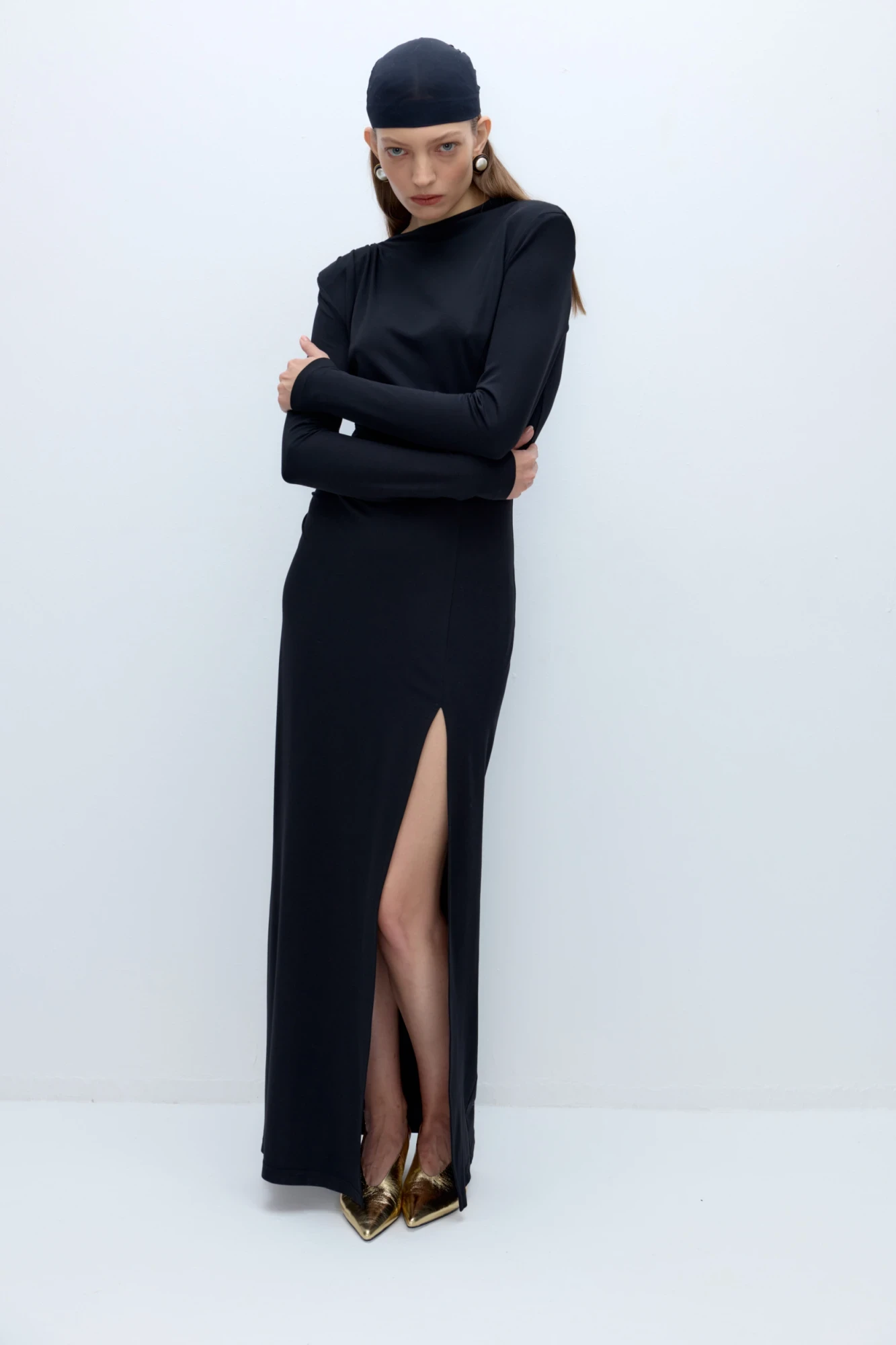 Детали: прилегающий силуэт, асимметричный крой, фигурный вырез горловины переда и спинки, втачные удлиненные рукава, потайная застежка по спинке.