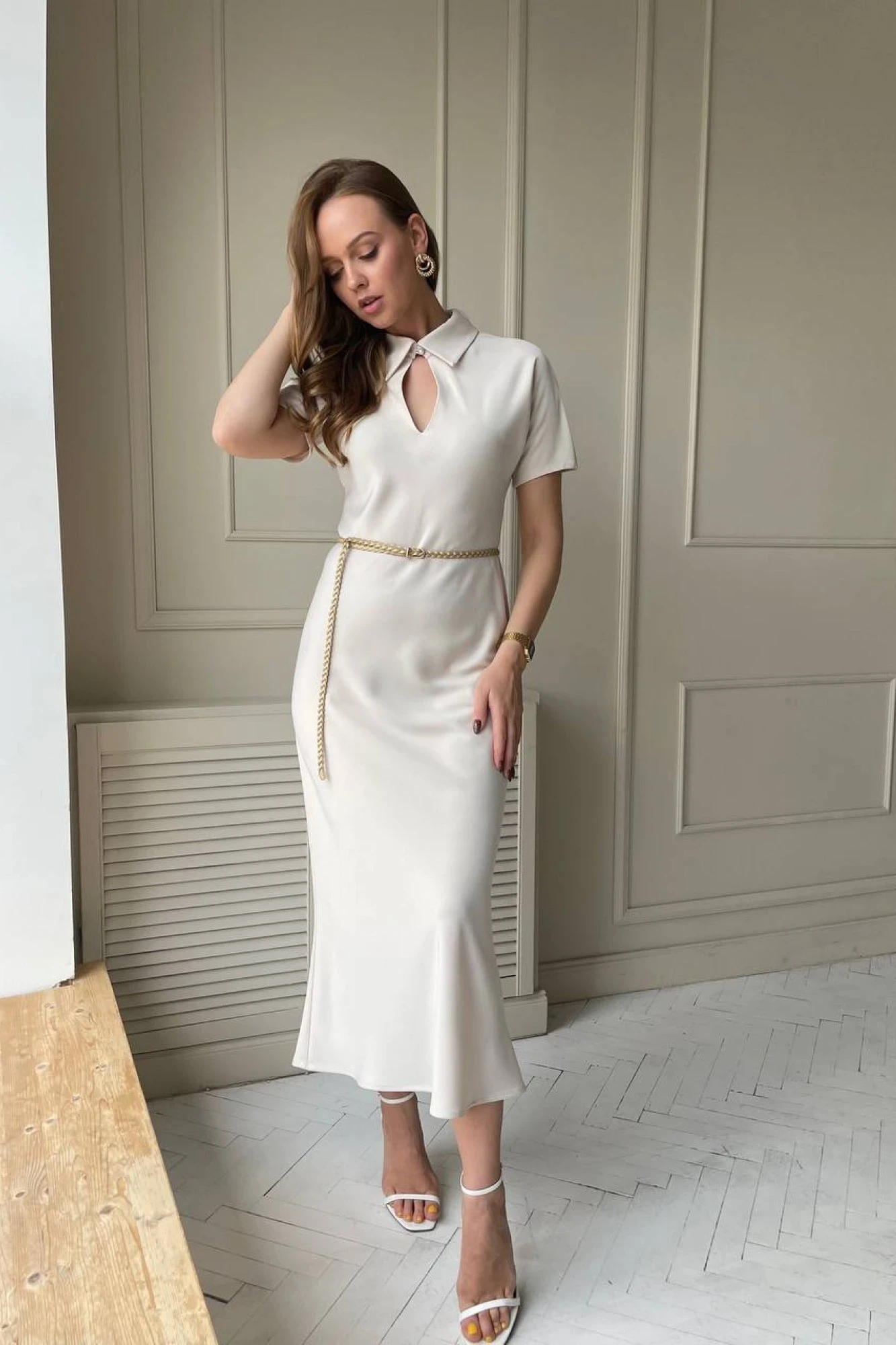 Элегантное платье миди из плательного атласа, с вырезом "капелька" по груди. Силуэт полуприлегающий, создавая стройный стильный образ. Ремешок в комплекте.