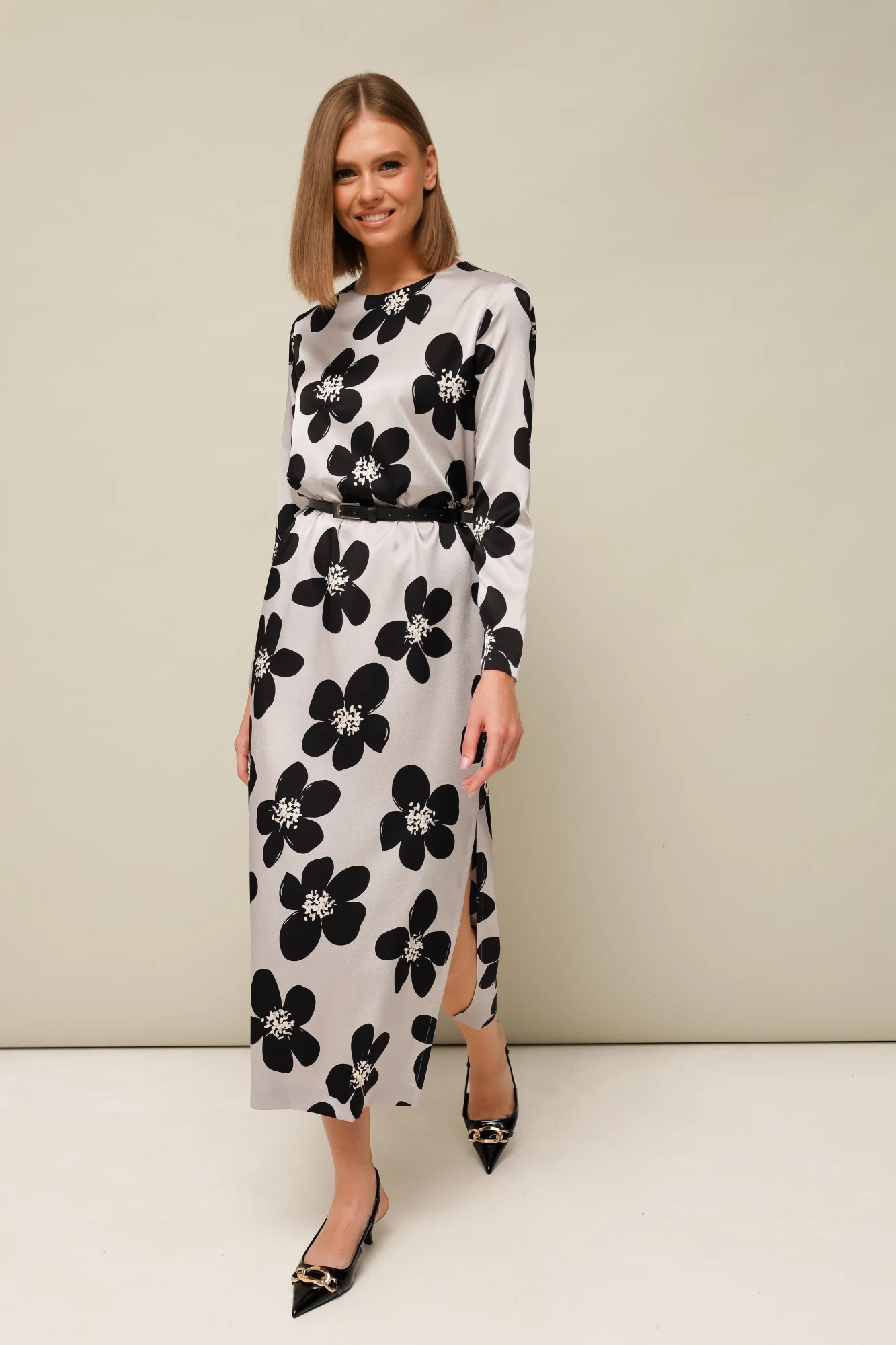 Элегантное платье прямого силуэта из гладкого сатина. В комплекте ремешок. Длина макси,рукав длинный. Фасон платья подойдет на любую фигуру, создаст романтичный нарядный образ.