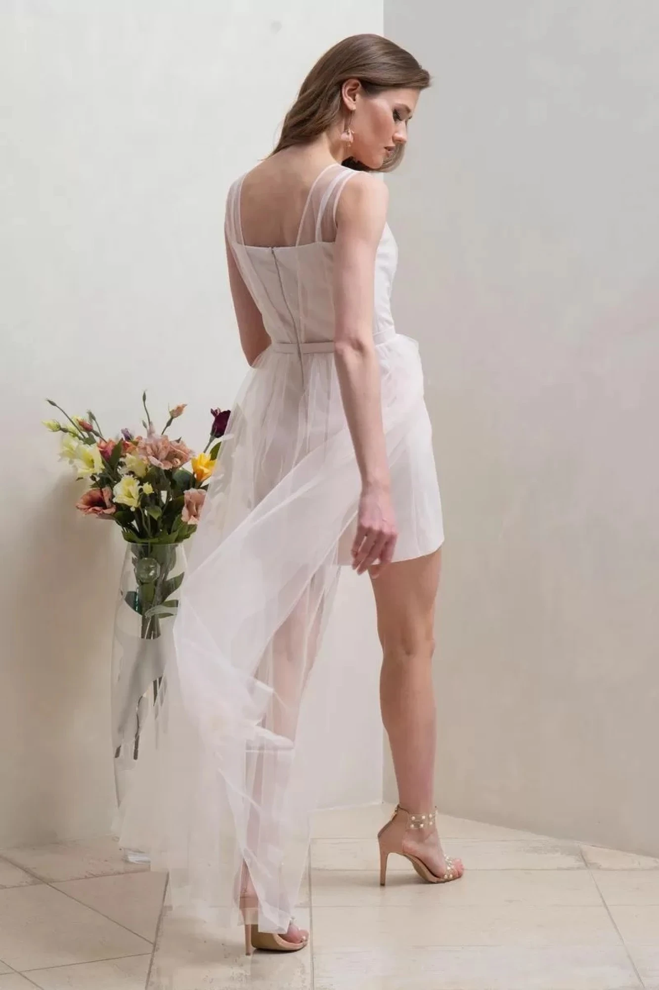 Вечернее платье длиной макси полуприлегающего силуэта, с отрезной расширенной юбкой по талии. Застежка на потайную тесьму молнию в среднем шве спинки. Платье двухслойное: верхнее прозрачное из сетки, нижнее - плотный мерцающий однотон длиной мини. Нижнее платье на тонких бретелях, с фигурным декольте. Верхнее - с глубоким «V»-образным вырезом, без рукавов. Тонкий притачной пояс подчеркивает изящность силуэта. Такая модель выгодно подчеркнет Ваши изящество и утонченность.