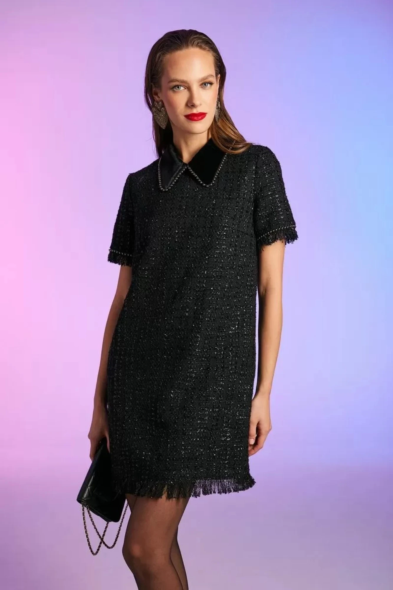 Платье прямого силуэта, из мягкой рогожки, длиной выше линии колена с рукавами длиной выше локтя, с нагрудными вытачками по переду и застёжкой на потайную молнию в среднем шве спинки. Горловина округлой формы, со стояче-отложным воротником из отделочного материала и тесьмой с бусинами по контуру воротника. По низу рукавов притачная бахрома с отделочной тесьмой с бусинами в шве притачивания. По низу платья обрезной срез с бахромой. Платье на подкладке.