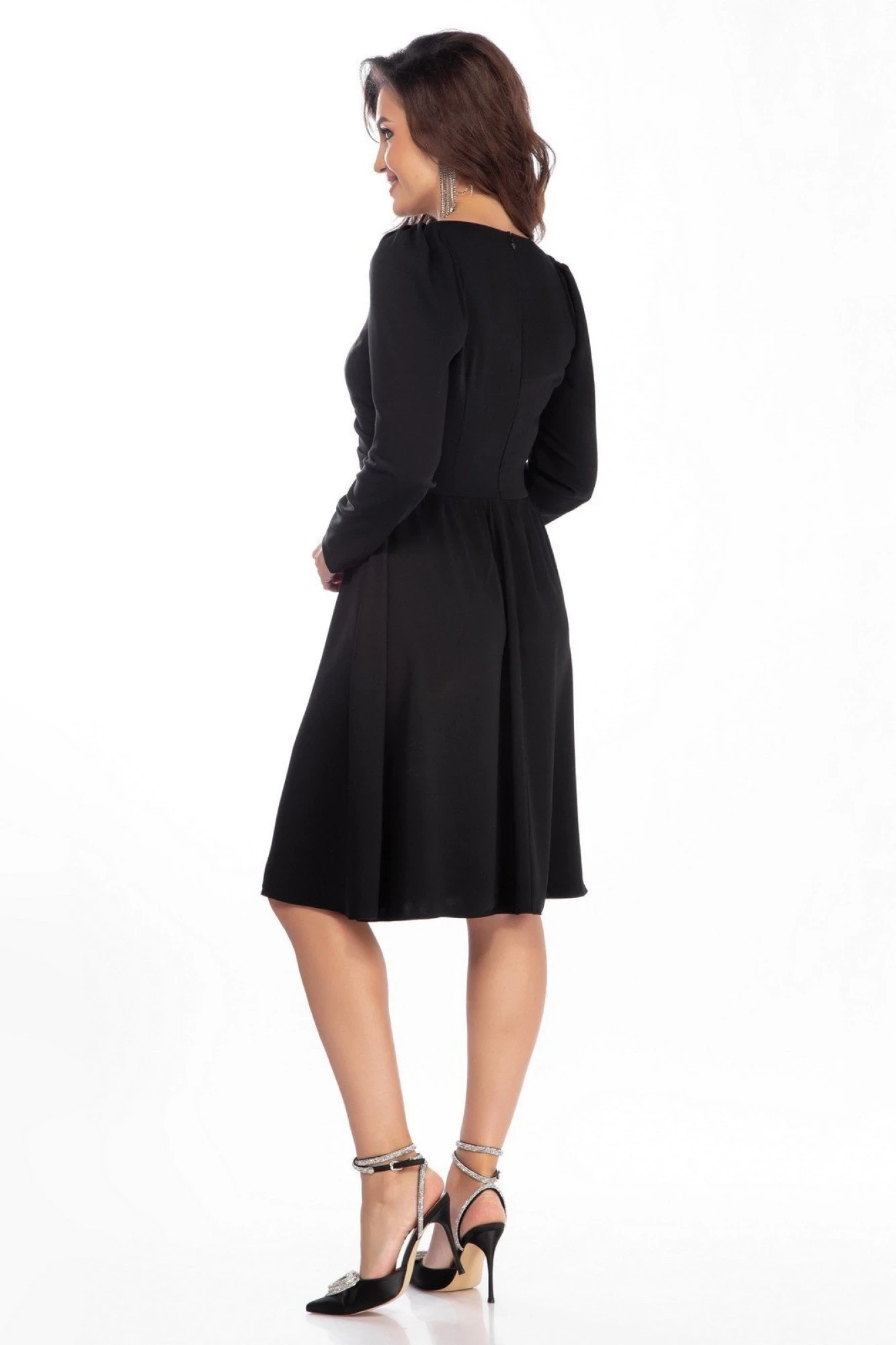 Платье прилегающего силуэта, отрезное по линии талии, к низу расширенное.