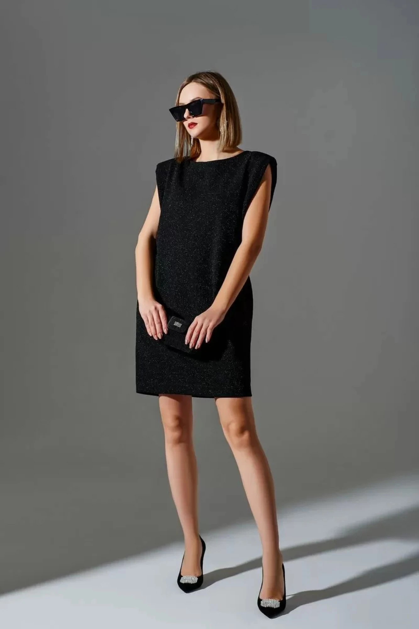 Платье прямого силуэта с подплечниками из трикотажного полотна с легким мерцанием.В боковых швах карманы. Длина платья: