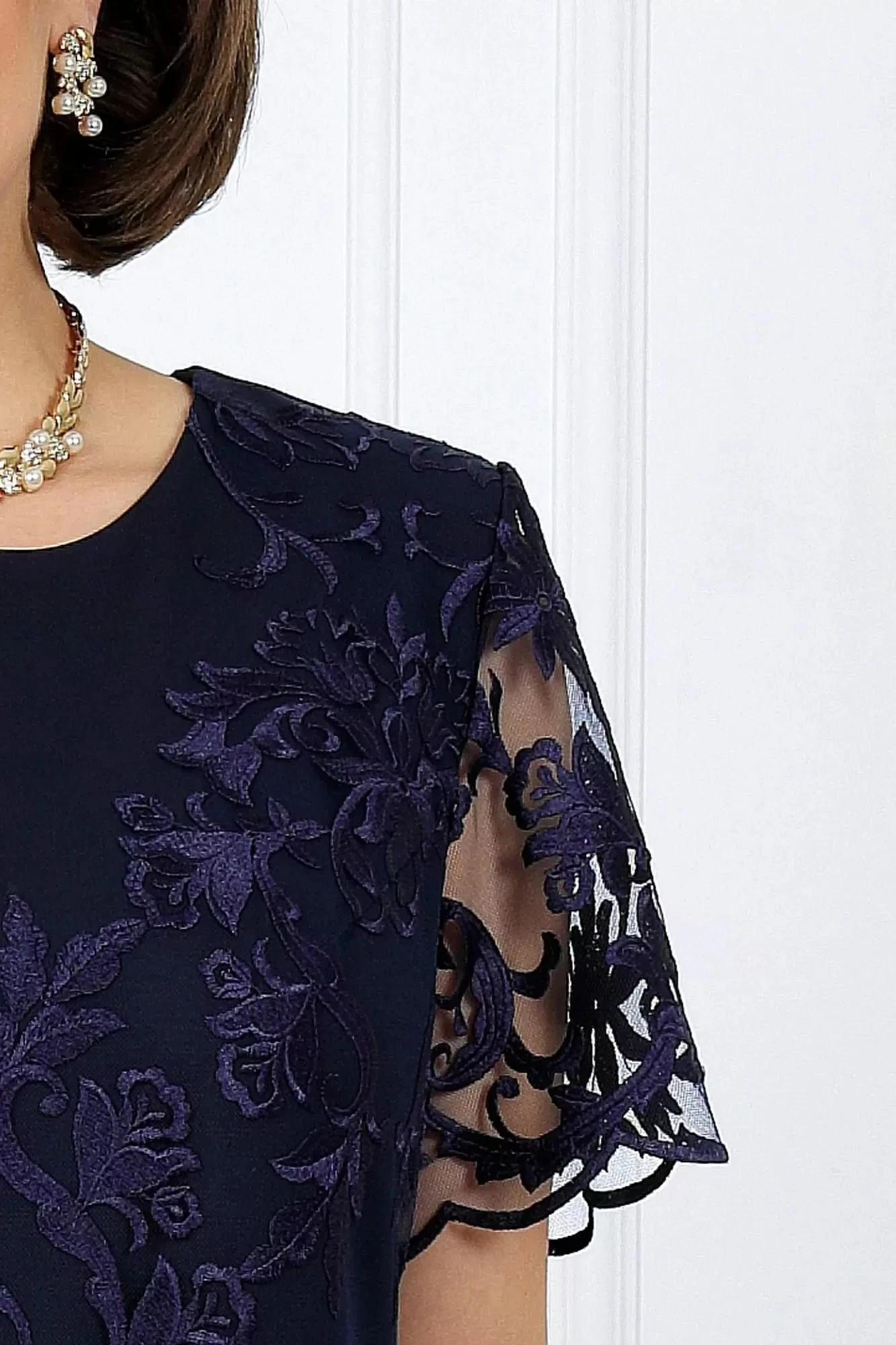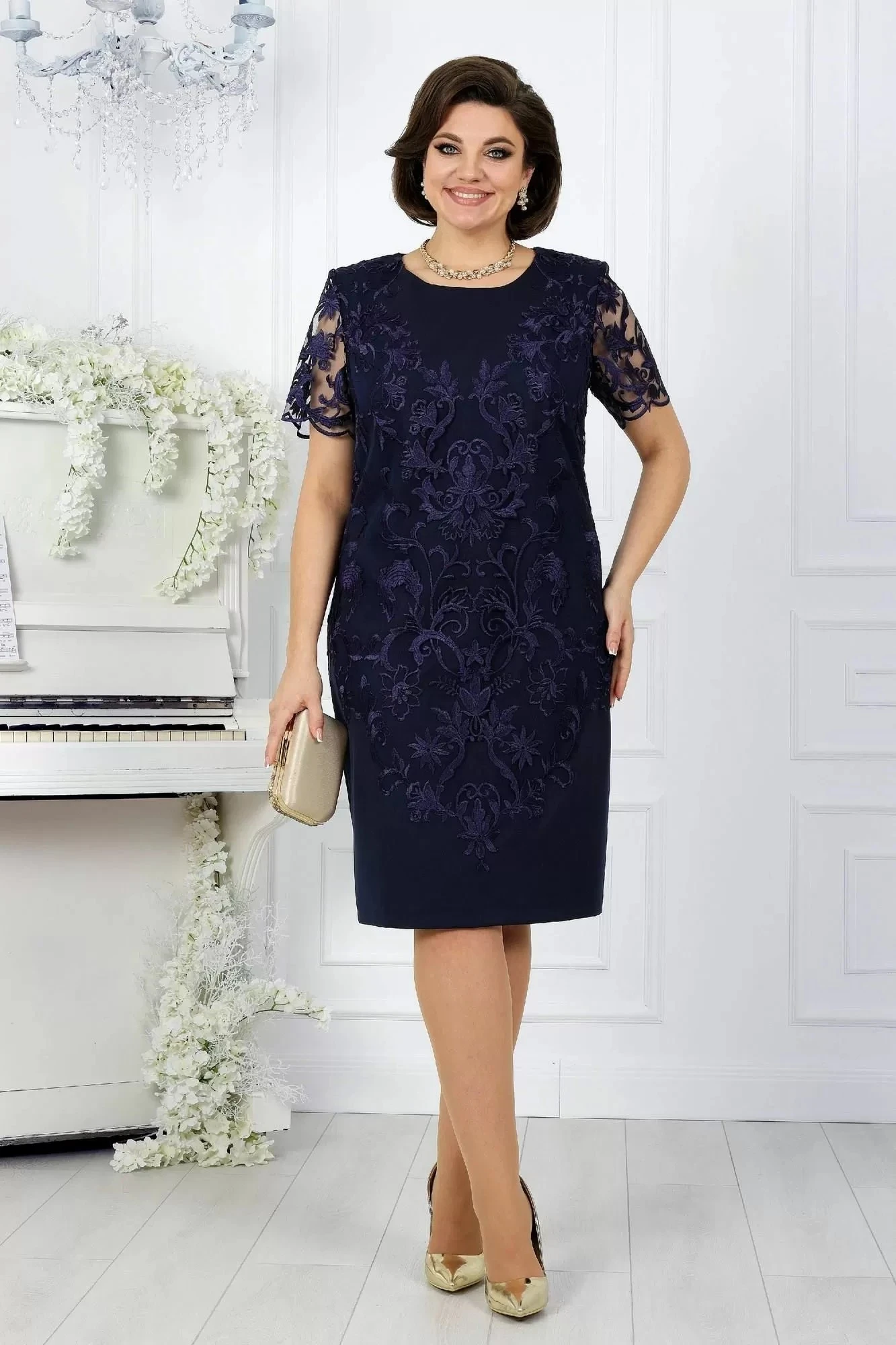 Платье женское, полуприлегающего силуэта, зауженное к низу, выполнено из костюмно- плательной ткани и кружева, длина по среднему шву спинки 110 см. Перед и спинка платья с настроченным гипюром, с фигурным низом, направленным от бокового шва вниз к центру. Перед с нагрудными выточками из проймы. Спинка с талиевыми вытачками и средним швом в котором обработана шлица. Застёжка на потайную тесьму -молнию расположена в левом боковом шве. Вырез горловины округлой формы. Рукава втачные, одношовные, длиной 34 см, из гипюра. Низа рукавов оформлены фестонами. Платье с плечевыми накладками.