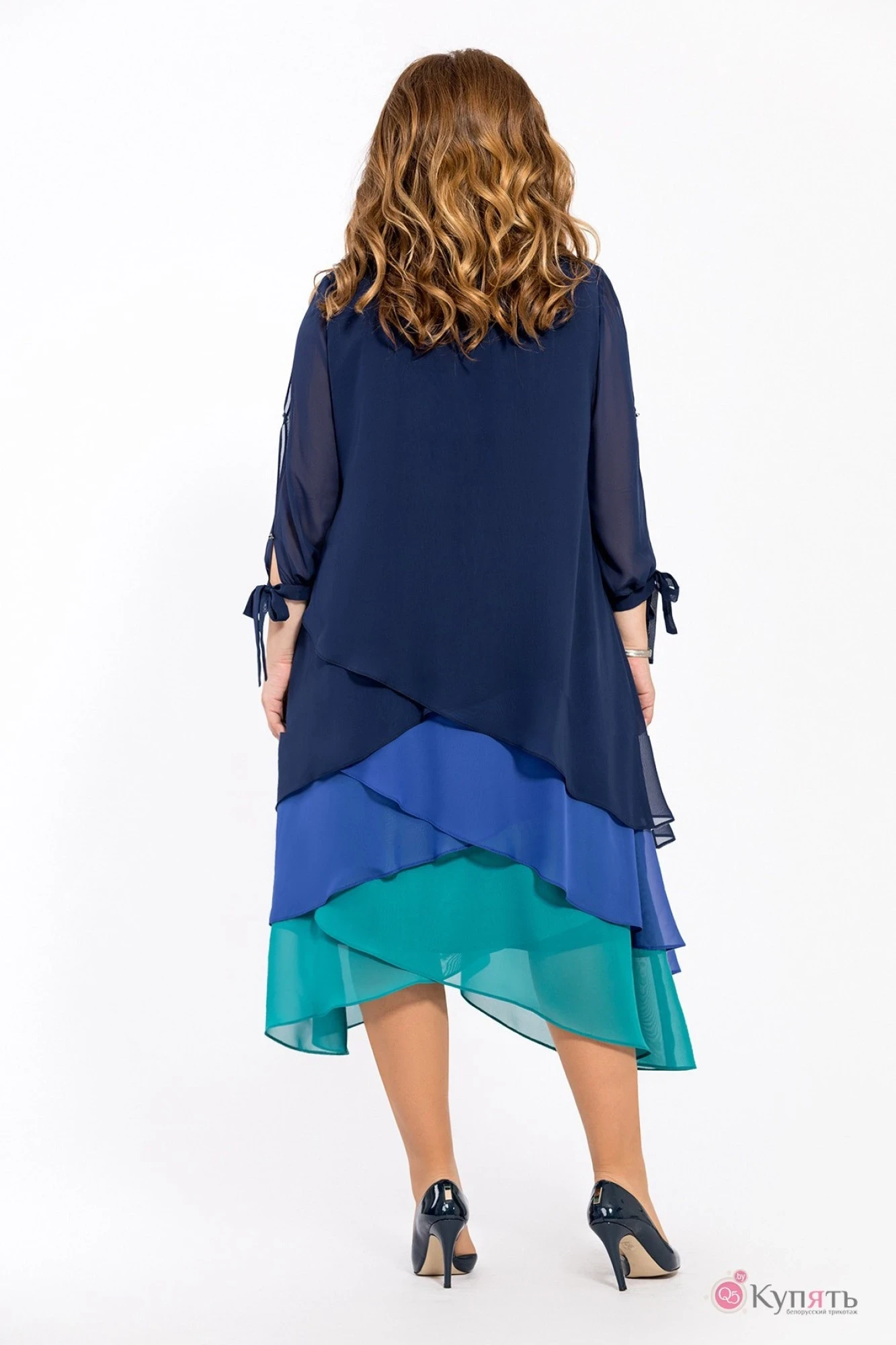 Трехъярусное платье из легкой струящейся ткани A-силуэта длиной миди. Рукав втачной, длиной 5/6, с фигурными отверстиями сбоку и с манжетой переходящей в бант. Вырез горловины v-образный. Платье на подкладке.
