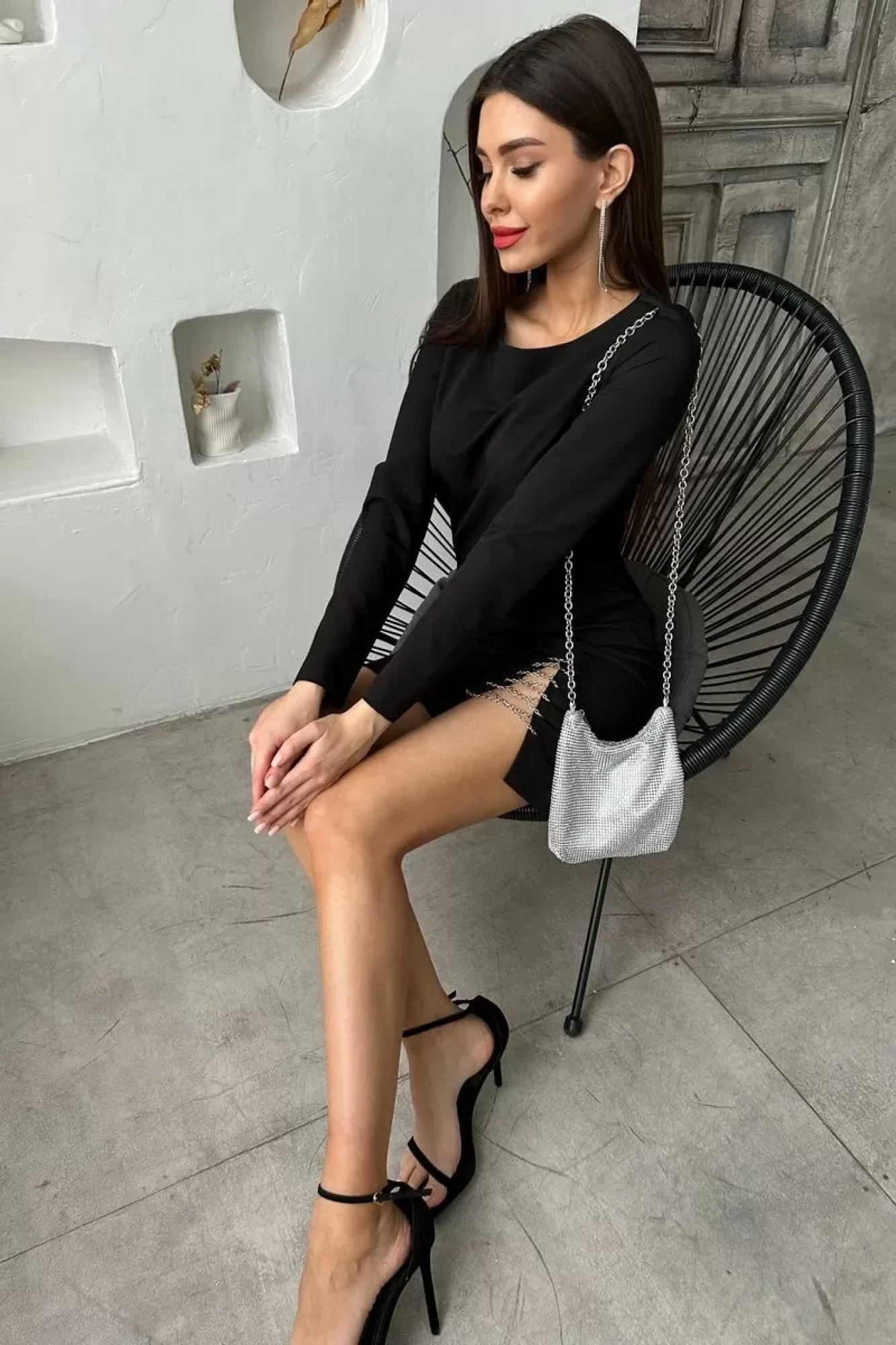 Платье мини с разрезом по ноге и декором из цепи.