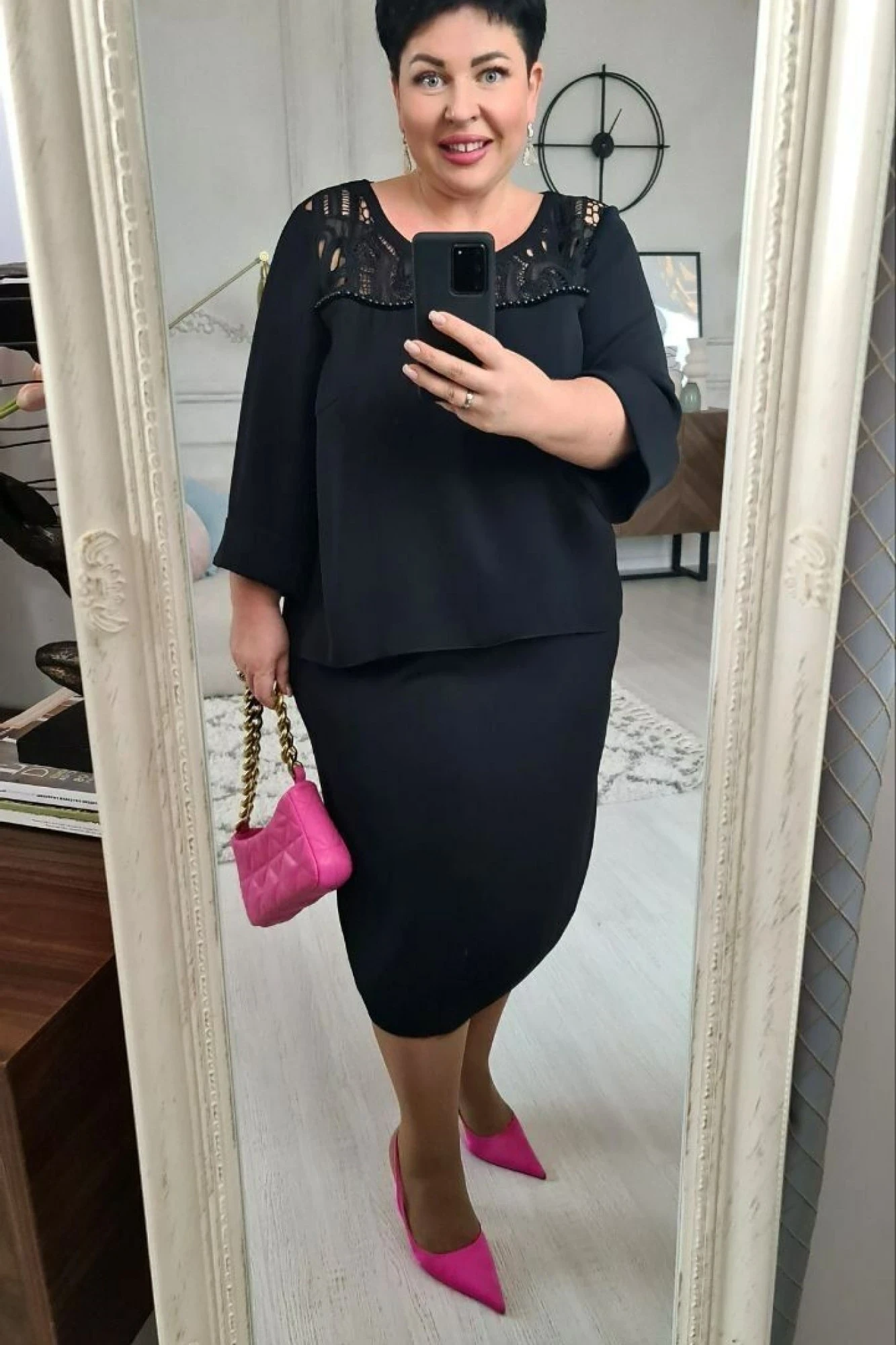Посмотрите, какое стильное и классное платье для любого случая! В меру дерзкое, лаконичное, а главное - очень удобное. Особый шарм платью придаёт сочетание фактур ткани. Платье прилегающего силуэта с отлетной деталью лифа, горловина в платье округлая. По переду платья вставка кокетки из кружева в тон, в подрез вставлена декоративная тесьма. Спинка со средним швом и шлицей, в отлетной детали по спинке вставка из кружева. Рукав втачной, длиной ниже локтя с отложной манжетой.