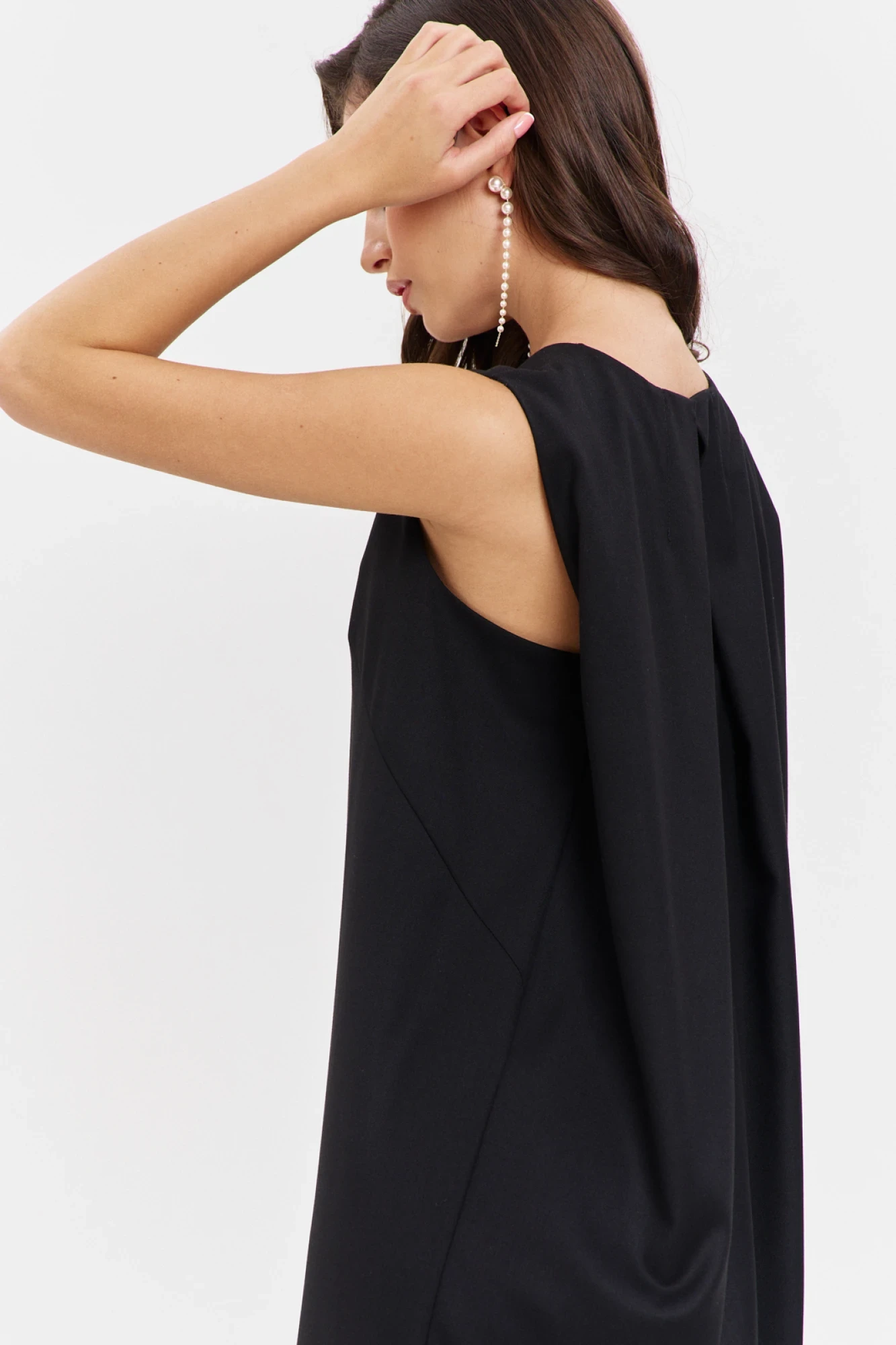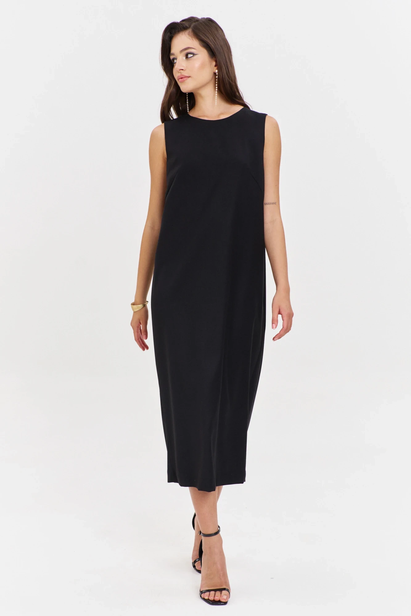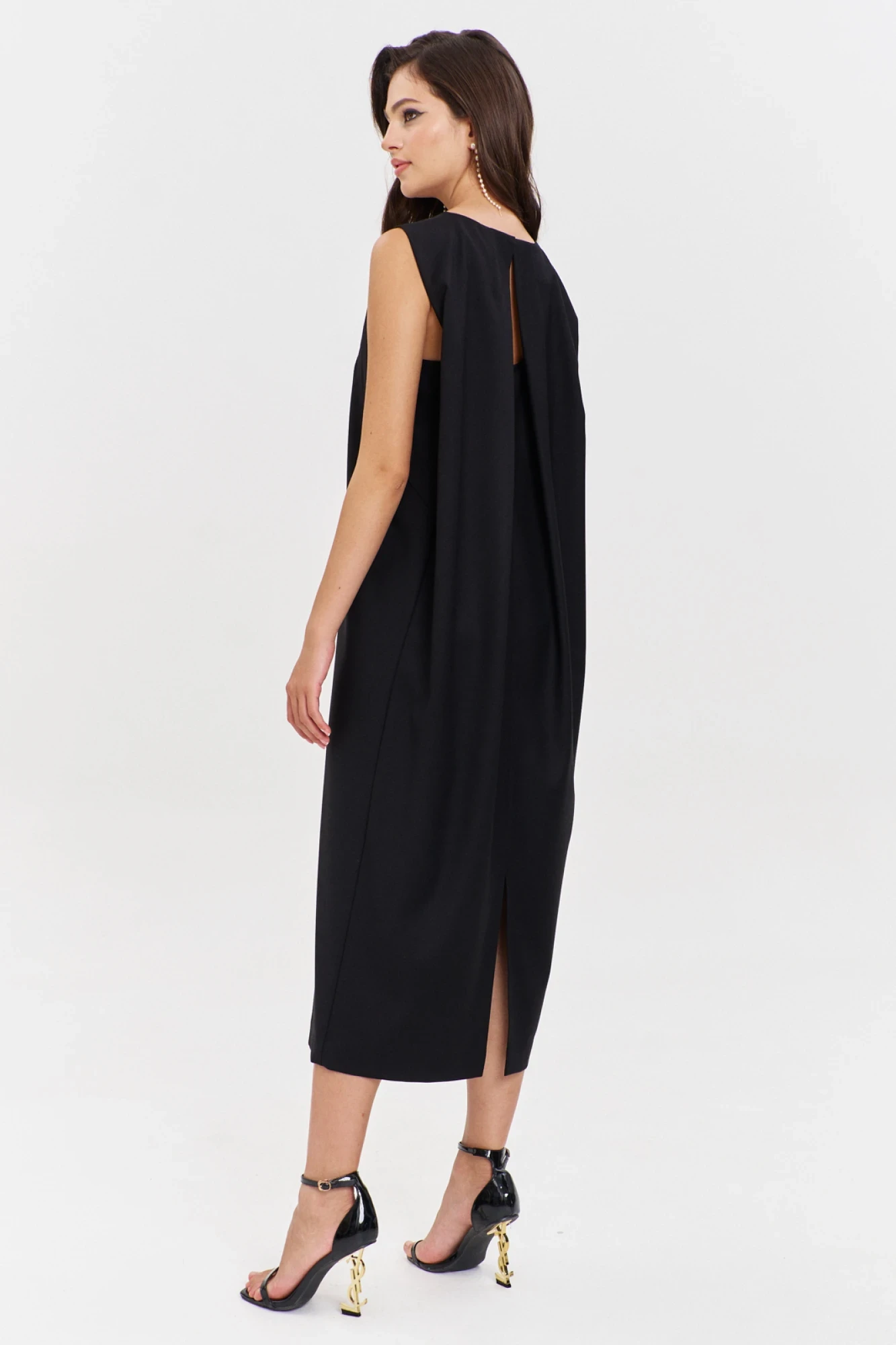 Платье свободного кроя, длиной до середины икры. Платье по спинке со средним швом, в котором обработан разрез. По центру спинки заложены встречные мягкие складки; по боковым, от плеча спинки заложены односторонние складки. Перед с нагрудными вытачками. Горловина округлой формы, с застежкой по спинке на кнопку.