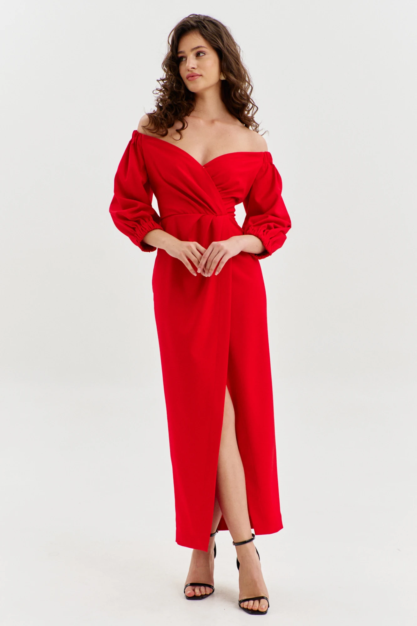 Платье полуприлегающего силуэта, длиной чуть ниже щиколотки. Платье отрезное по линии талии. Лиф спинки с талиевыми вытачками. Юбка спинки с талиевыми вытачками. В среднем шве спинки обработана застежка на потайную тесьму-«молнию». Лиф переда выполнен на запах с мягкими односторонними складками. Юбка переда выполнена на запах. Верхнее переднее полотнище с мягкими односторонними складками. Платье с открытыми плечами. Рукава одношовные, втачные, длиной 3/4. По окату рукава и низу вставлена резинка.