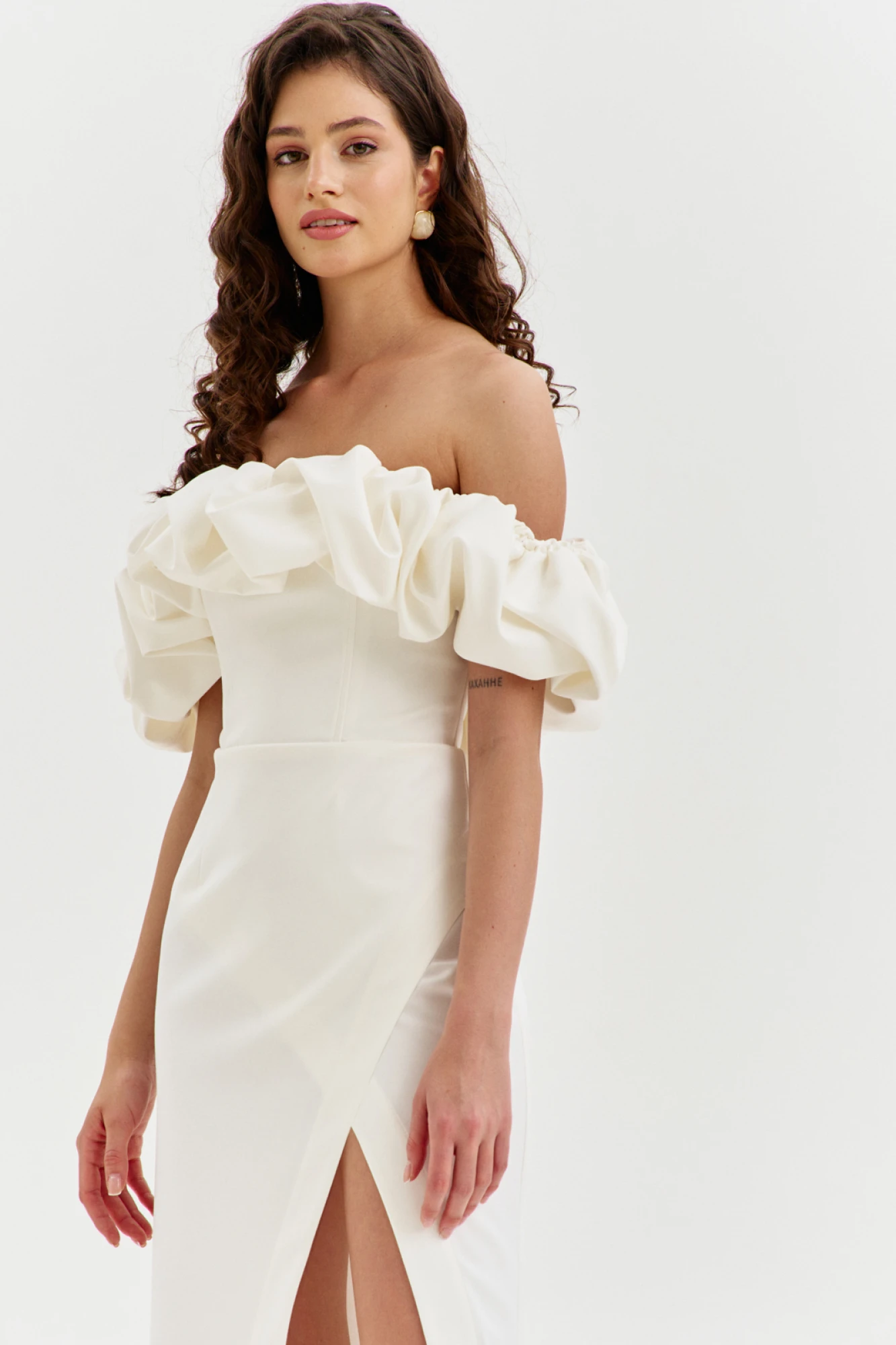 Платье прилегающего силуэта, длиной до середины икры. Платье отрезное по линии талии. Лиф платья выполнен в виде корсета со шнуровкой по спинке. Юбка спинки с талиевыми вытачками и средним швом, в котором обработана застежка на потайную тесьму-«молнию». Юбка переда выполнена на запах с ассиметричным разрезом. Платье с объемным декором в области груди, рук и спинки.