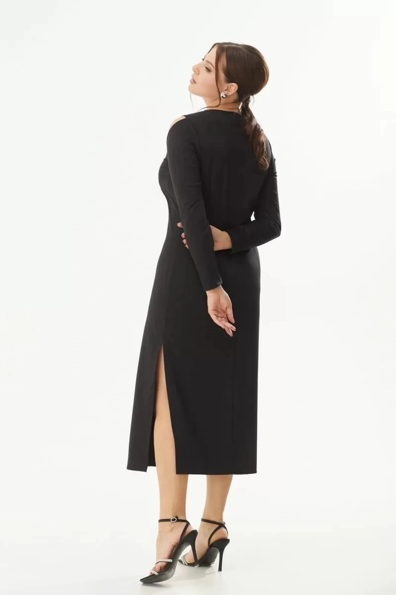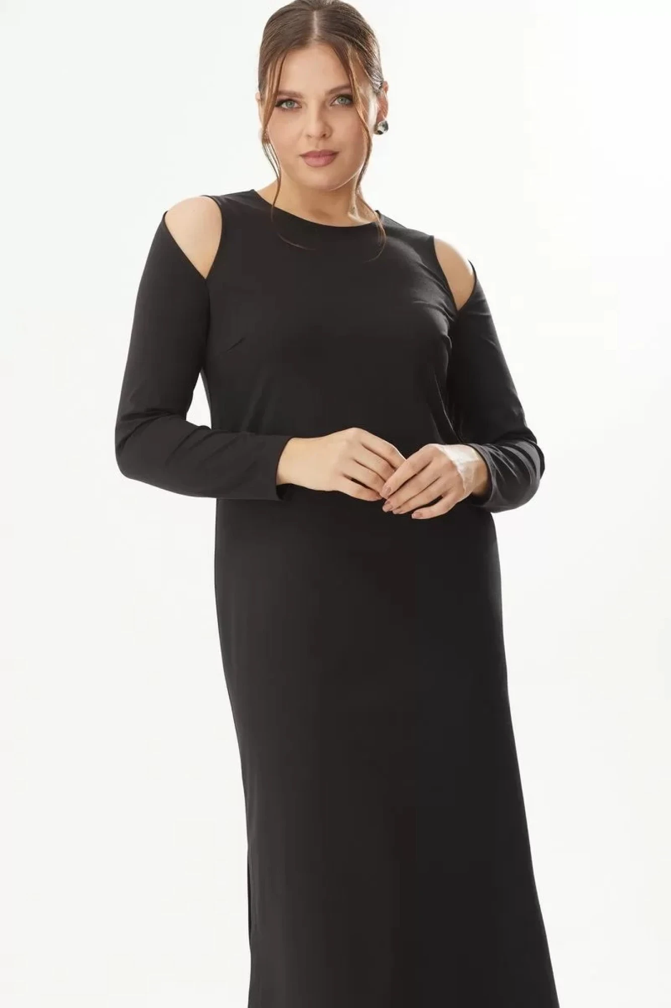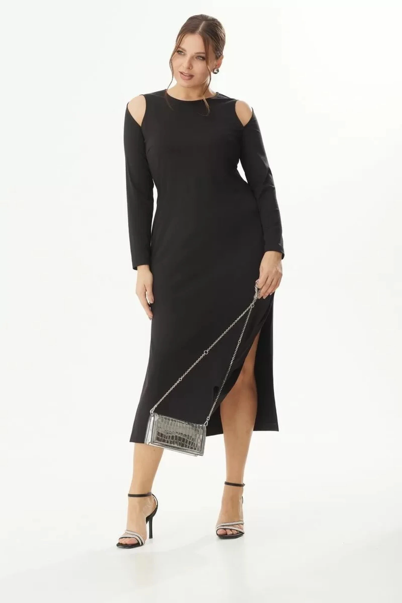 Трикотажное платье прилегающего силуэта с соблазнительными вырезами на плечах. Платье с нагрудными вытачками, средним швом и талиевыми вытачками по спинке, и разрезами в боковых швах ( с двух сторон ). Рукав втачной зауженный. Лаконичное и безупречное черное платье миди будет лучшим подарком для праздника и повседневной носки.