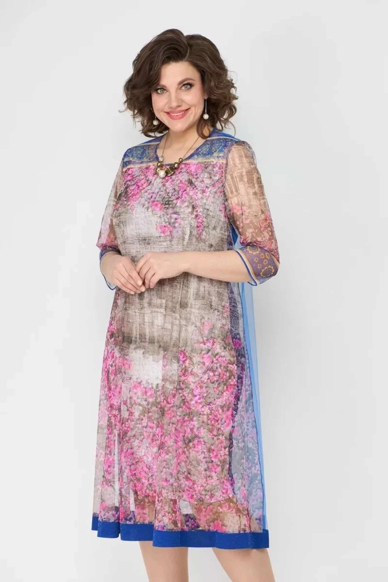 Комплект женский из костюмно-плательной ткани. Комплект состоит из двух платьев. Нижнее платье прилегающего силуэта. По переду платья выполнен рисунок,а спинка выполнена из однотонной ткани. Верхнее платье свободного силуэта, клешеное от груди из очень красивой сетки с цветочным принтом. Перед нижнего платья цельный с нагрудными выточками,горловина с овальным вырезом. Спинка нижнего платья цельная с талевыми вытачками. Рукава верхнего платья втачные,одношовные,3/4 из ткани сетки однотонной и с манжетами из отделочной ткани шириной 5 см,нижнее платье без рукавов. Низ верхнего платья обработан планкой из отделочной ткани шириной 5 см.