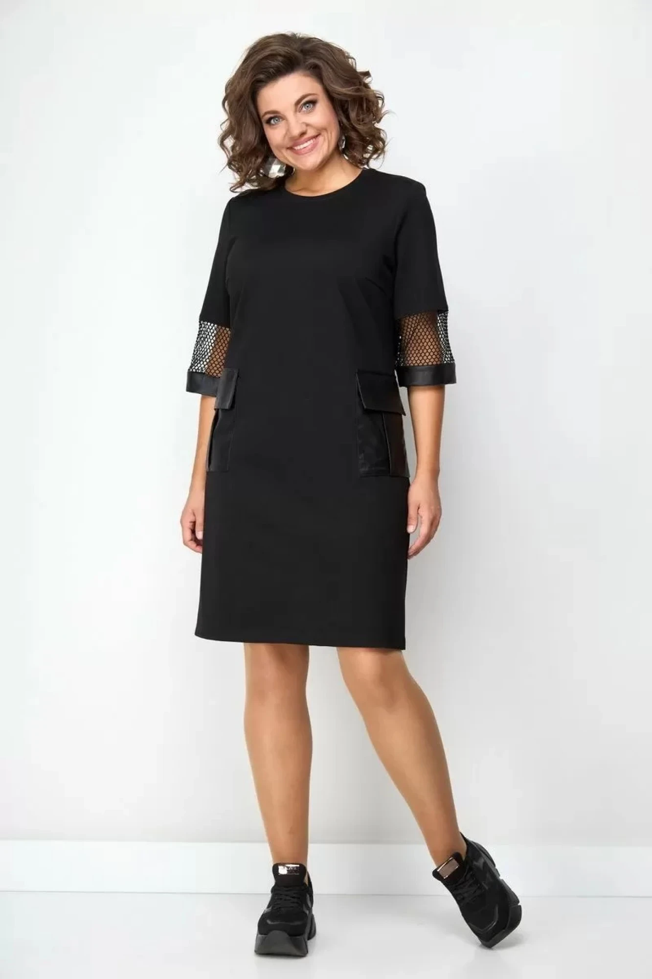 Платье женское из приятного к телу трикотажа. По переду нагрудные выточки. Горловина округлая. Рукав втачной,3/4 , верхняя часть рукава выполнена из трикотажа, нижняя часть выполнена из плотной сетки ,а манжеты из эко-кожи. Украшением платья служат большие накладные карманы так же из эко-кожи. Спинка прямая.