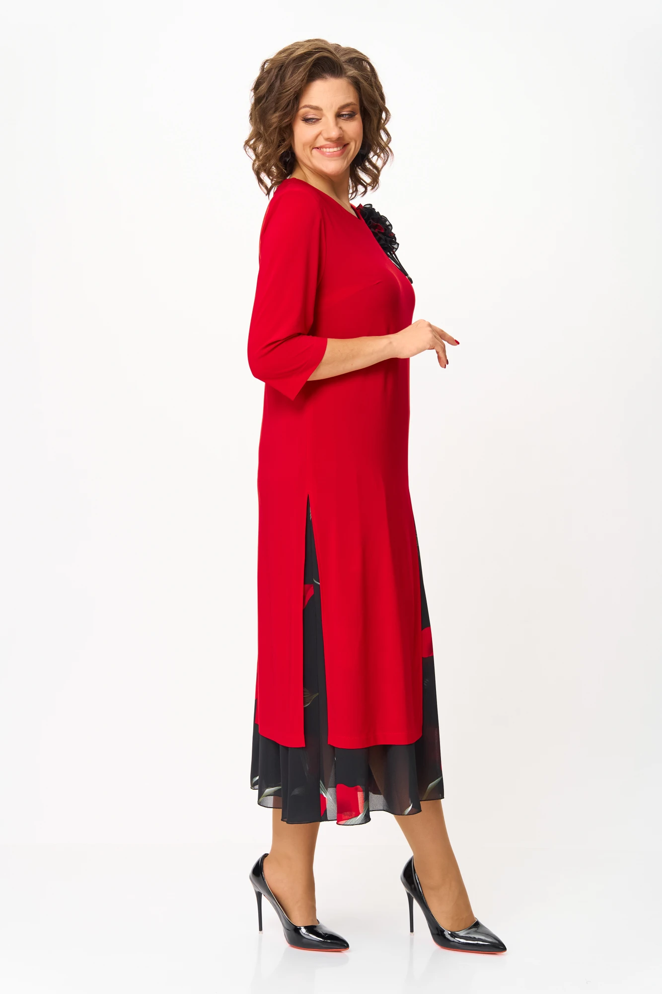 Платье женское полуприлегающего силуэта расширенное к низу, выполнено в комплектации из двух предметов. Верхнее платье –из мягкого эластичного материала, с высокими разрезами по переду, спинке и бокам, с втачным рукавом ¾. По линии груди вытачки. По левой части переда съемный цветок.