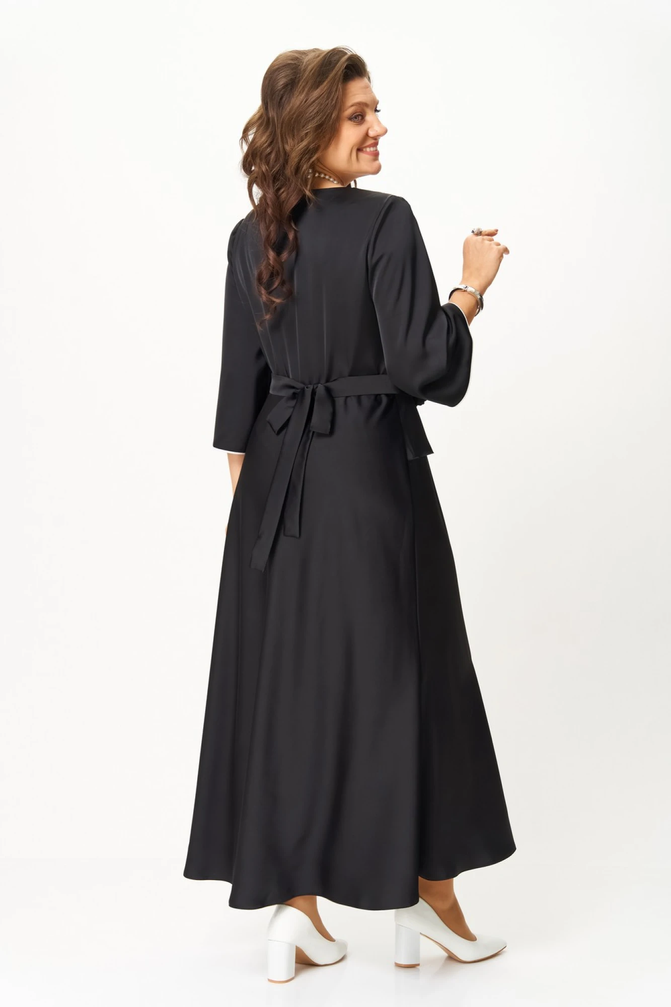 Рукав длиной 7/8 расширен к низу с отделкой кантом. По линии талии съемный пояс с украшением ручной работы в виде роз. Такое платье отлично подойдет как для вечернего выхода, так и для более формальных событий.