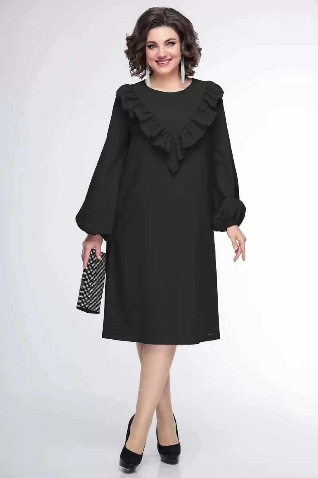 Платье женское прямого силуэта. Выполнено из плательной ткани. Платье с длинными объёмными рукавами, по низу которых, вставлена эластичная тесьма. От линии плеча до центральной части переда, расположена отрезная кокетка, в которую вставлен декоративный волан на сборке. В нижней части платья пришит фирменный логотип. Спинка платья цельнокроеная. В области горловины – капелька, застёгивающаяся на навесную петлю и декоративную пуговицу.