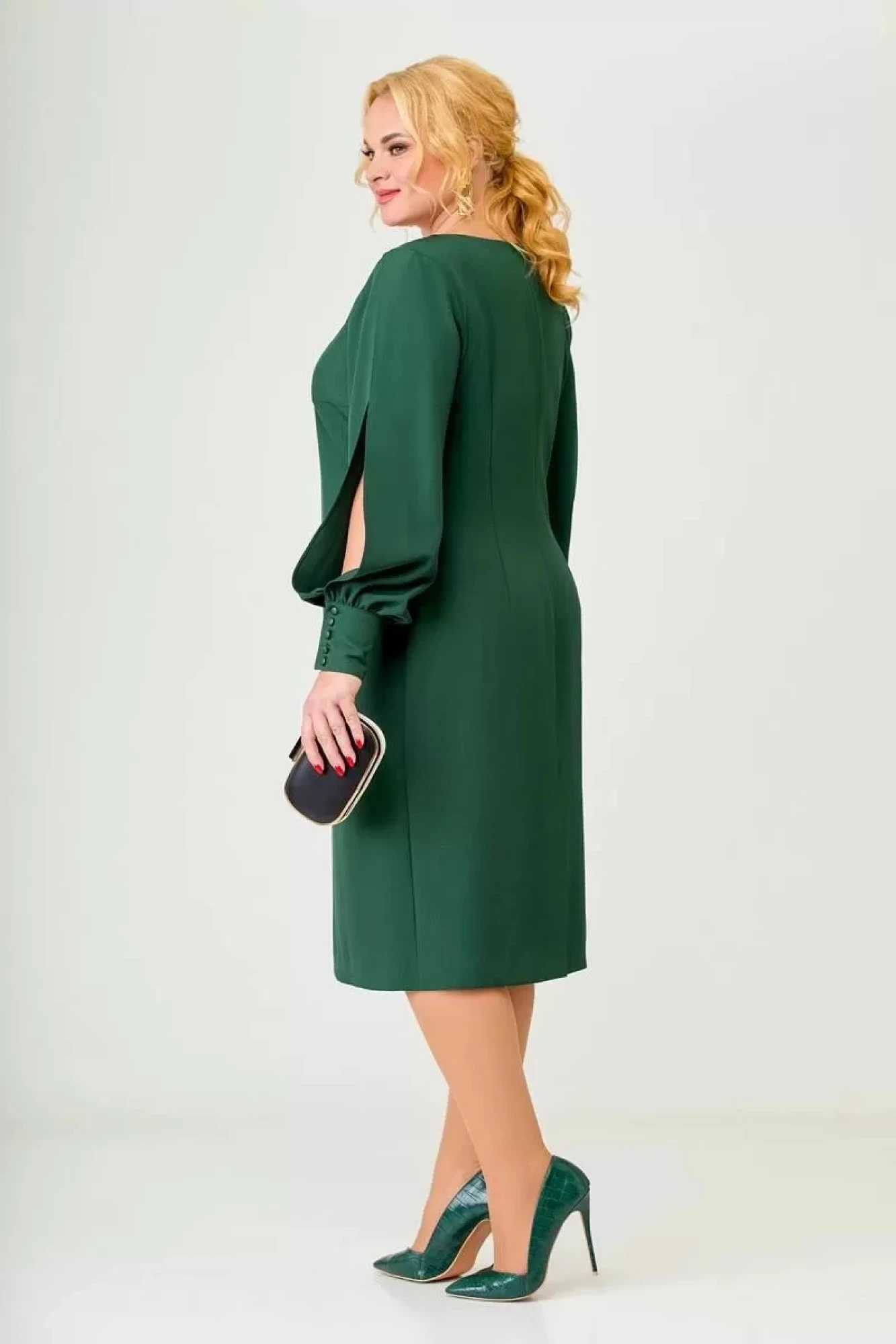 Платье полуприлегающего силуэта, с длинными объёмными рукавами. В области локтевого шва, от проймы до низа, обработан разрез. По низу рукавов манжеты, которые застёгиваются на 5 петель и 5 декоративных пуговиц. Горловина платья круглая. По переду платья расположены нагрудные вытачки. Спинка с талиевыми вытачками и средним швом, в который вставлена потайная молния. По низу спинки обработана шлица.