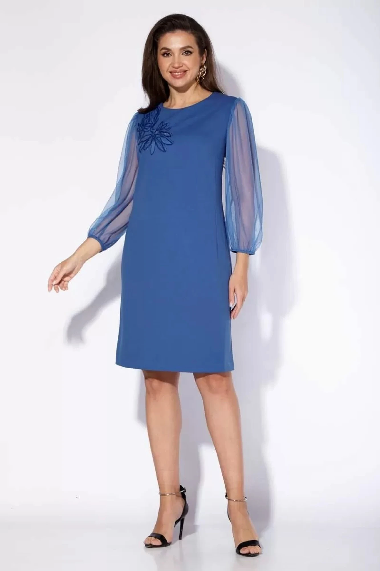 Платье женское, полуприлегающего силуэта с рукавом длиной 7/8. Рукав выполнен из отделочной ткани(сетка), фантазийной формы. По верху рукава сборка. Низ так же присобран на узкую резинку. По переду нагрудные и талевые вытачки. Перед платья, сверху задекорирован вышивкой. Вырез горловины круглой формы. По спинке средний шов и талевые вытачки. Застежка в шве на потайную "молнию". По низу разрез.