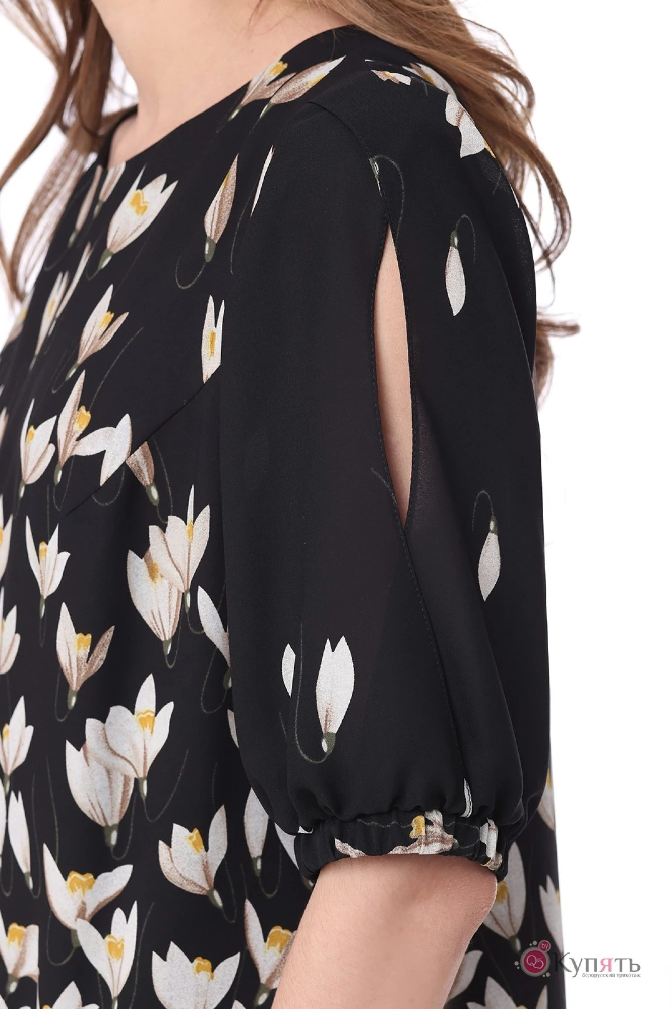 Элегантное платье из купонной ткани свободного силуэта. Рукав фантазийной формы длиной до локтя. По центру рукава-фигурный запах с разрезом. Низ рукава типа "Фонарик" присборен на манжет с эластичной тесьмой. По переду платья-нагрудные вытачки. Вырез горловины круглой формы. Застежка сзади в виде "капли"на навесную петлю и пуговицу. Платье на трикотажной подкладке.
