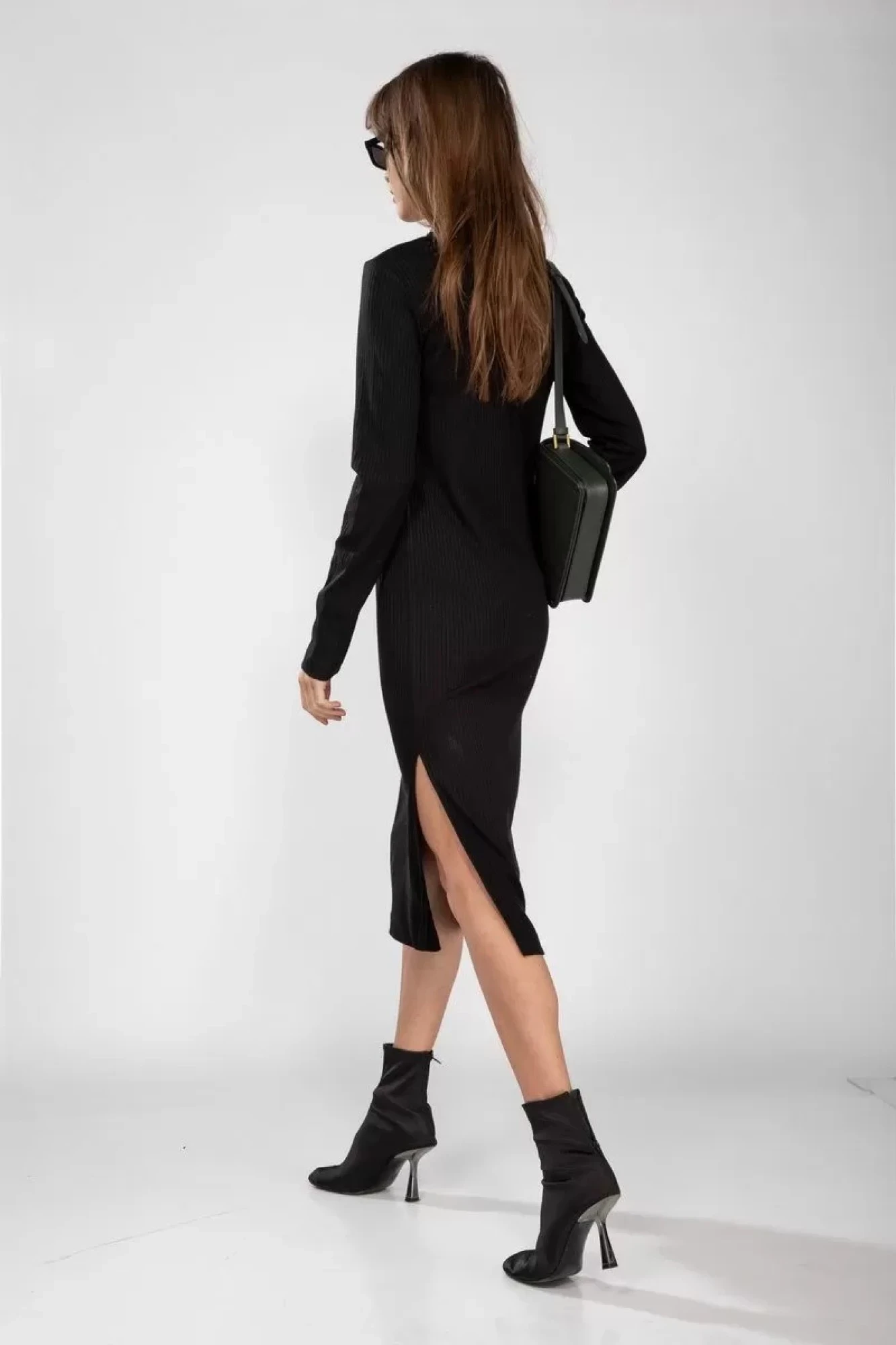 Трикотажное платье полуприлегающего силуэта выполнено из мягкого трикотажа, которое не сковывает ваши движения и подчеркивает достоинтсва фигуры, на рукавах прорези для пальцев,сбоку платья разрез.Длина рукава 63см, длина платья 98см