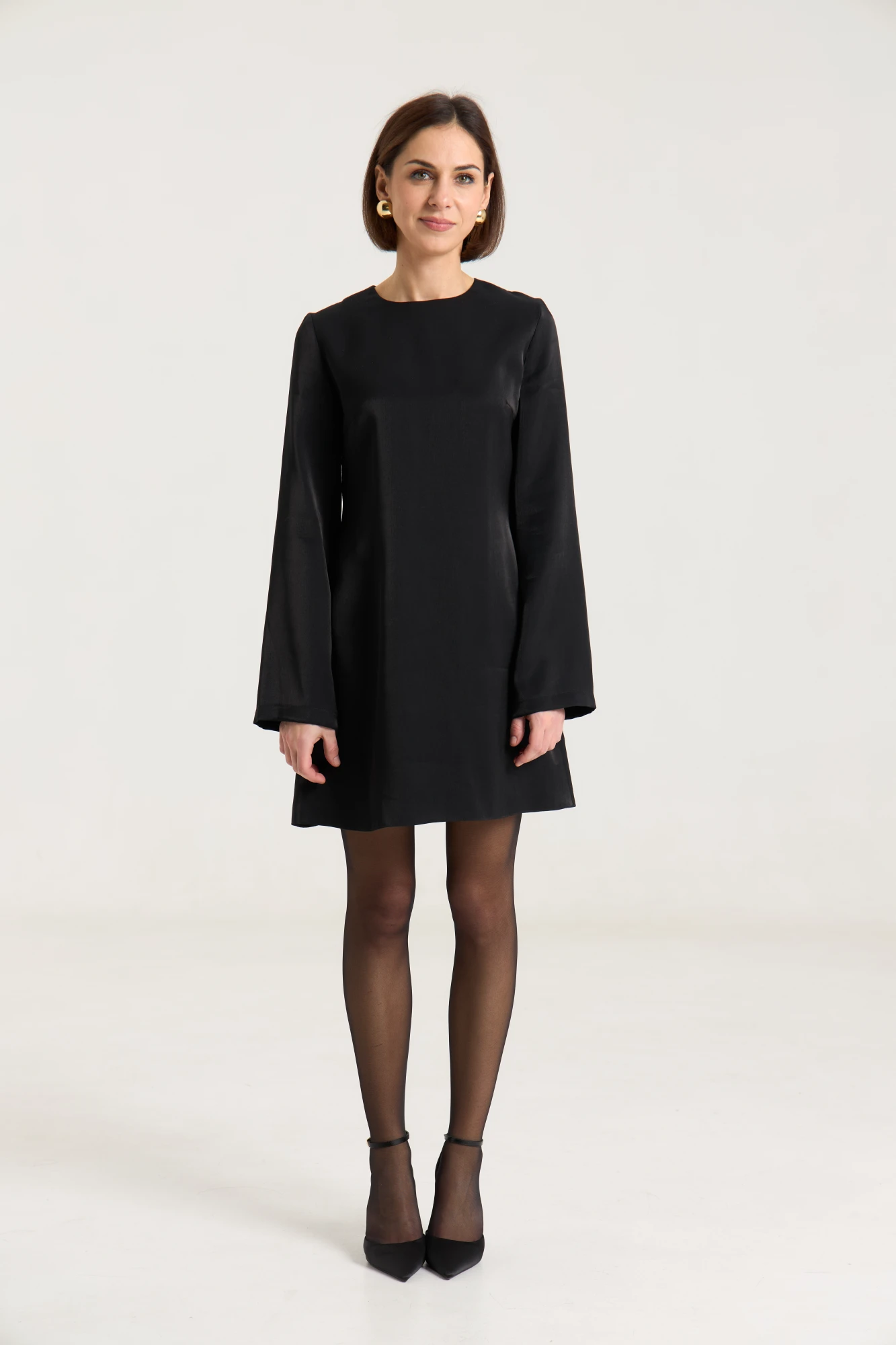 Платье полуприлегающего силуэта, расклешнное к низу, рукав свободный, втачной. По груди нагрудные выточки, по спинке талиевые выточки, застежка на потайную молнию в среднем шве. Платье выполнено излегкой вискозной ткани в черном цвете, ткань имеет красивый серебряный блеск и выглядит дорого.Платье без подкладки. Длина по спинке 85 см, полуобхват груди - 44 см, длина рукава - 63 см, длина плеча - 11 см в 42-м размере. Рост модели на фото 168 см.