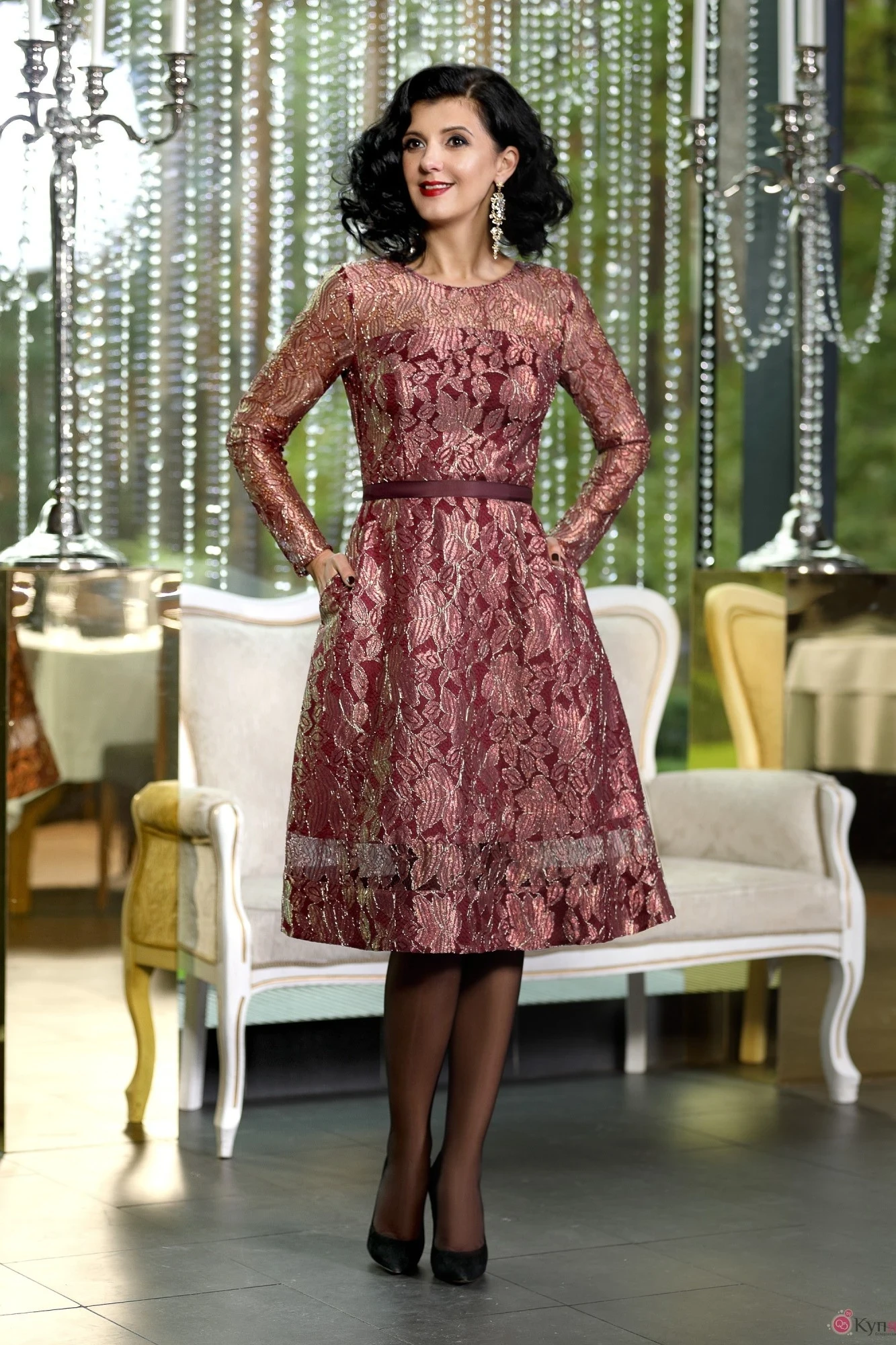 Платье женское отрезное по линии талии с расклешенной юбкой. Верхняя часть платья прилегающего силуэта. Застежка на декоративную тесьму молнию по среднему шву спинки. Карманы в боковых швах. Рукав втачной длинный. По нижней части изделия декоративная кружевная вставка, длина ниже линии колена.