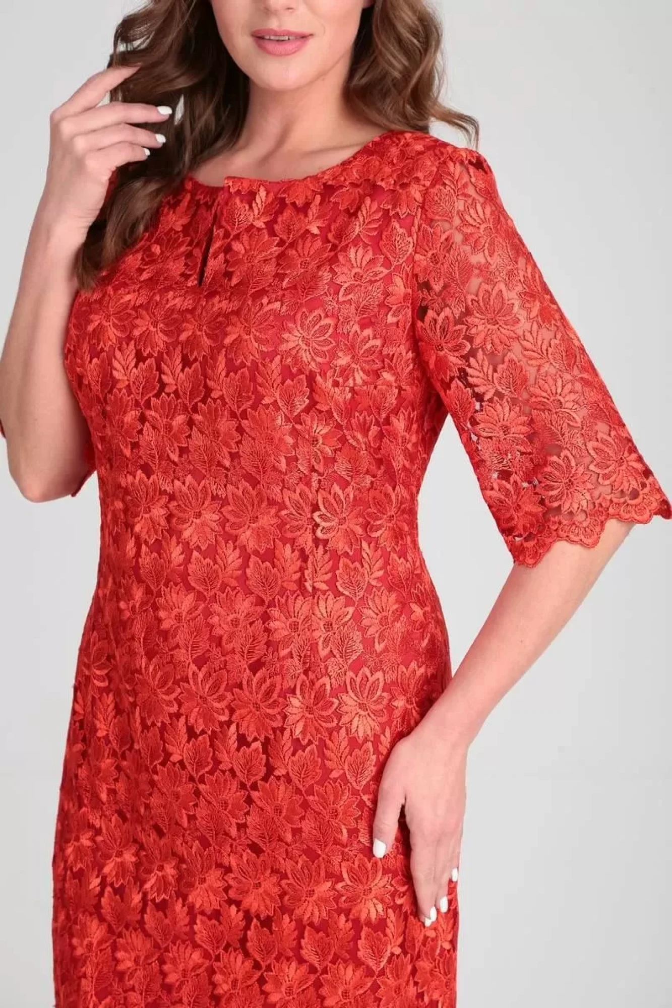 Нарядное платье полуприлегающего силуэта. Выполнено из двух видов ткани. Верх платья кружевной, нижнее выполнено из атласной ткани. Платье без подкладки и без плечевых накладок. Вырез горловину круглый с декоративным разрезом. Рукав 3/4. По низу платья и рукава фестоны. По среднему шву спинки разрез. Потайная молния в боковом шве. Длина платья по спинке 104 см