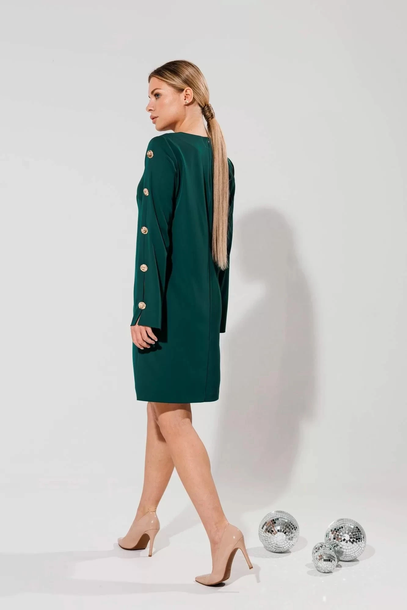 Платье женское А- силуэта. Горловина округлой формы.. Рукав длинный, втачной с декоративными разрезами украшенными пуговицами.По переду обработаны нагрудные вытачки. Спинка со средним швом. Застежка на молнию