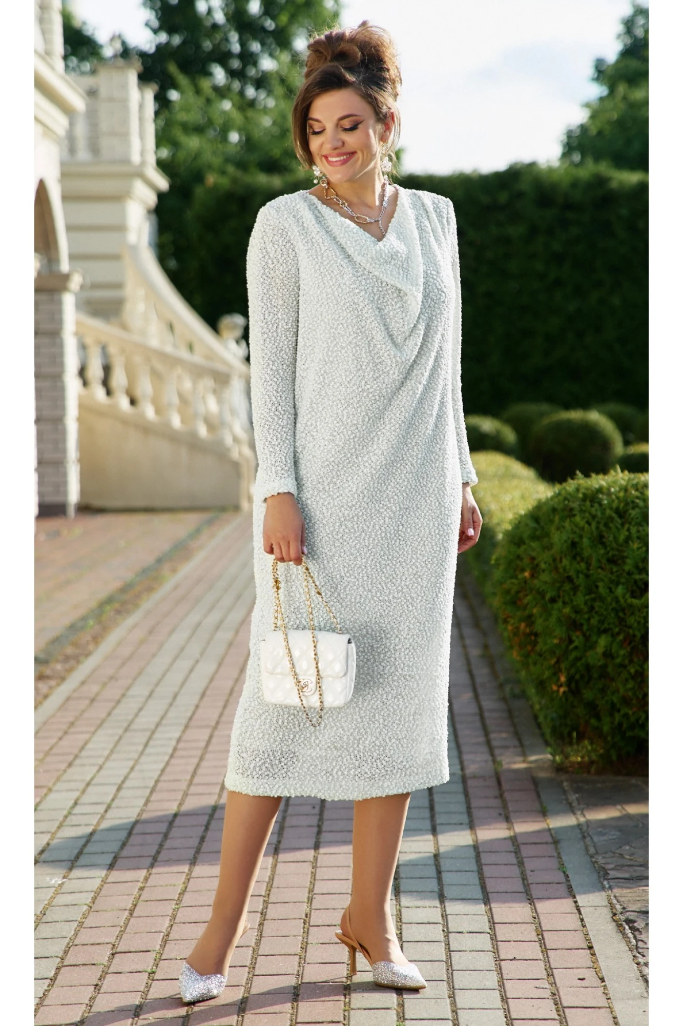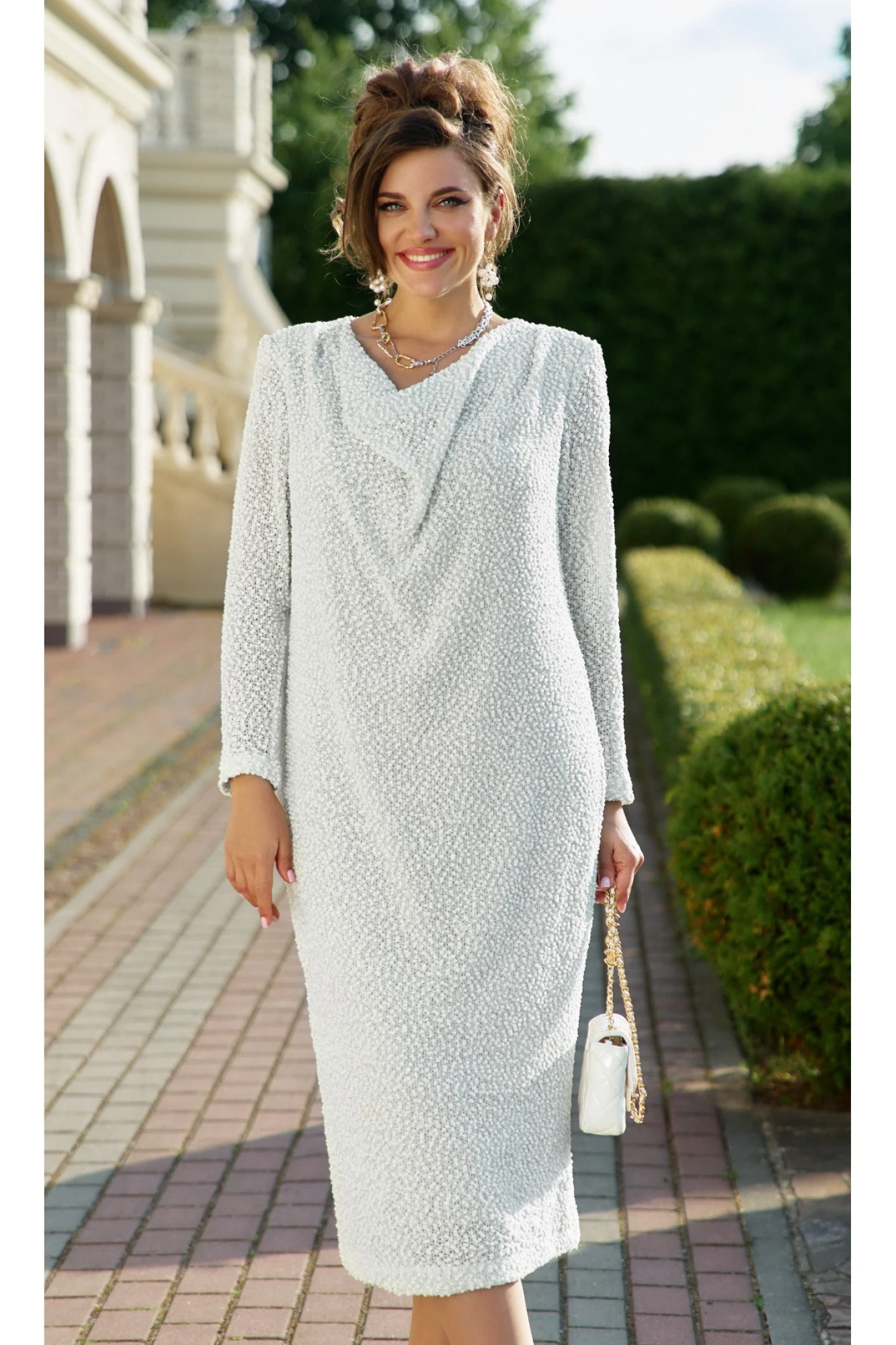 Это платье — как легкое колебание между элегантностью и непринужденностью. Оно обволакивает фигуру, невесомое, струящееся, сотканное из тончайшего трикотажа с деликатной фактурной основой и тончайшей люрексовой ниткой. Оно словно создано для женщины, которая ценит не только комфорт, но и поэзию в деталях. Полотно платья свободно ниспадает от плеч, даря свободу движения. Платье прямого силуэта с акцентной деталью в виде качели по переду платья, с заложенными складками по плечу. Линия плеча имеет ровную форму. Рукав втачной, длинный.
