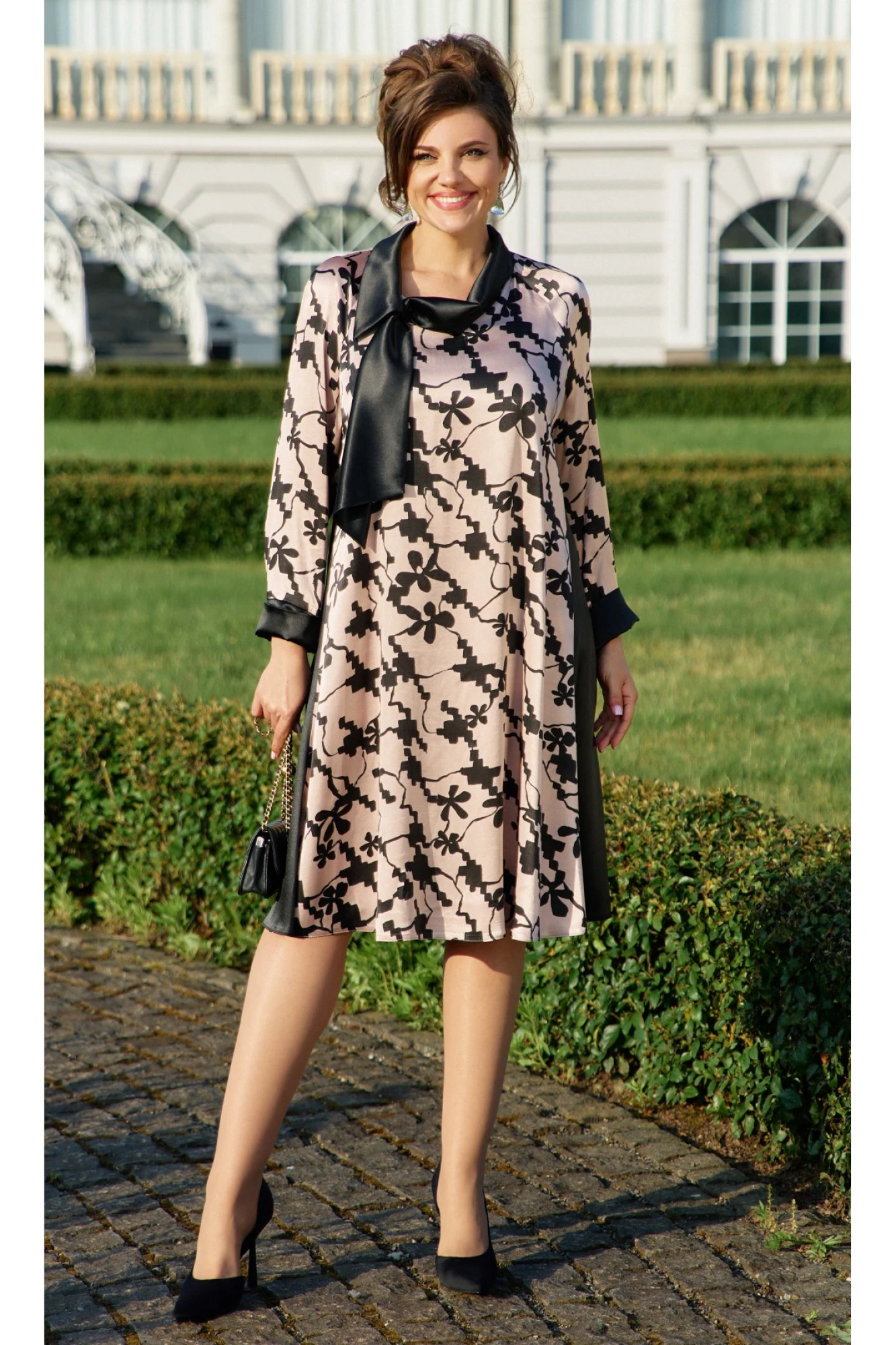 Представляем вашему вниманию элегантное платье, которое станет воплощением стиля и женственности. Выполненное из гладкой, струящейся ткани, оно дарит ощущение легкости и комфорта при носке. Основной фон платья в нежном модном оттенке сезона « мокко» украшен контрастным черным геометрическим узором, переплетающимся с флористическими мотивами, что придает ему особую изюминку. Платье свободного трапециевидного силуэта с ассиметричным воротником создает акцент на зоне декольте и придает платью утонченный вид. В боковых швах платья вставки из отделочной ткани чёрного цвета, что визуально корректирует фигуру. Рукав в платье реглан, длинный с заложенными складками по низу, широкими черными отложными манжетами, которые добавляют образу строгости и элегантности. Это платье идеально подходит как для деловых встреч, так и для вечерних мероприятий, подчеркивая ваш безупречный вкус. Оно легко сочетается с различными аксессуарами, позволяя создавать разнообразные образы.