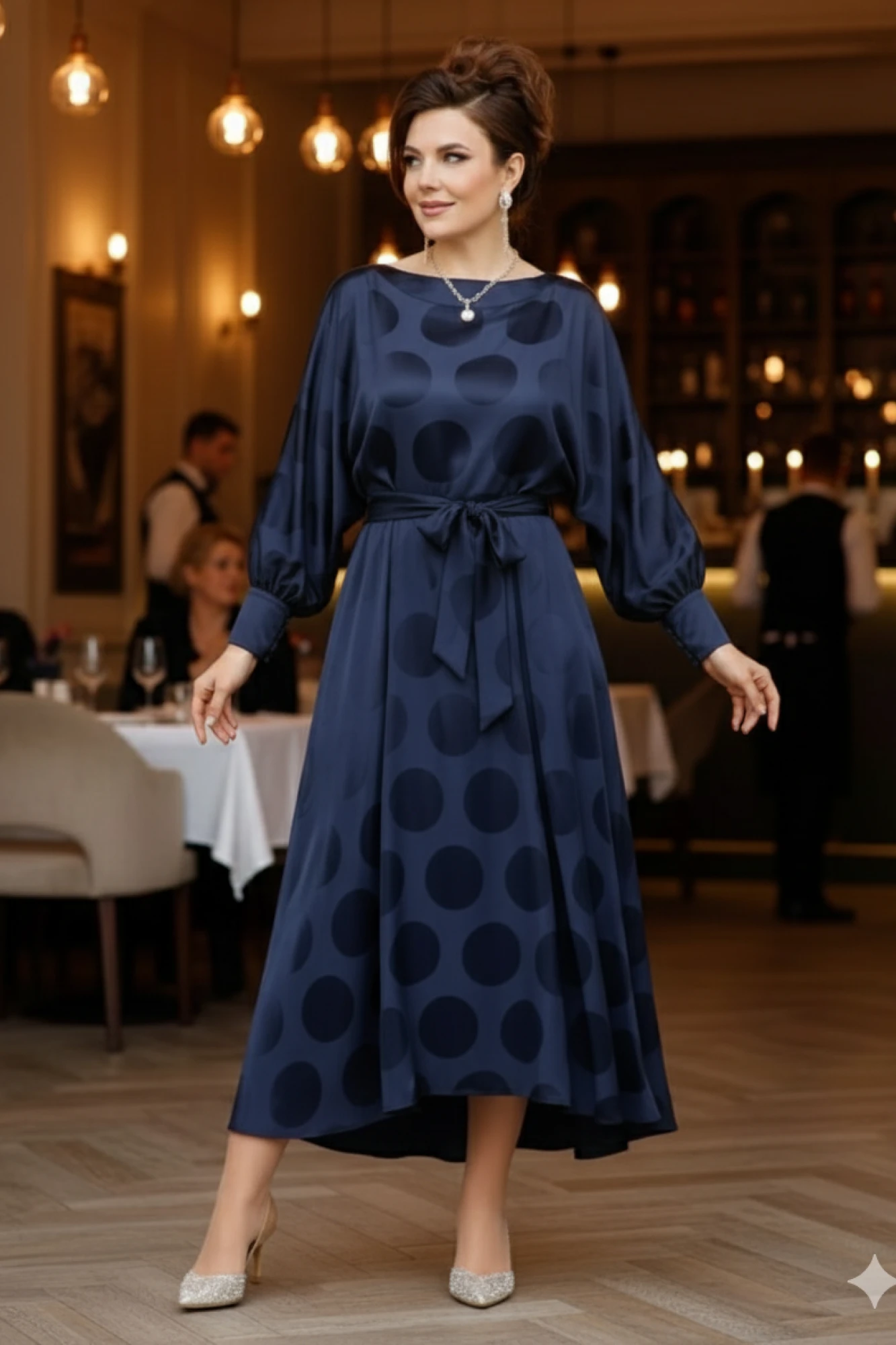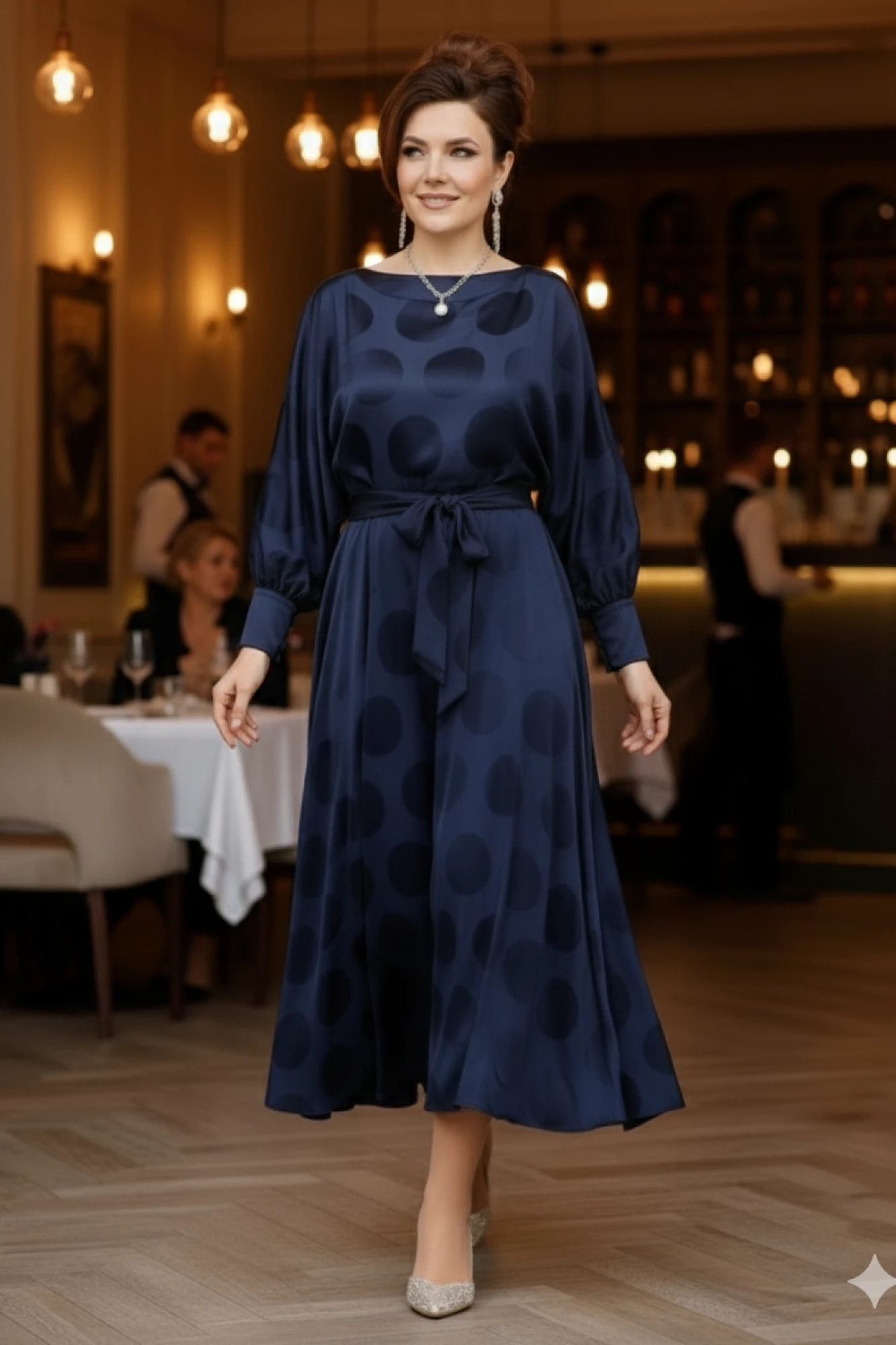 Состав: 70% вискоза, 30% хлопок, подкладка 100% полиэстер. Элегантное вечернее платье-миди выполнено из благородного шелковистого материала насыщенного темно-синего оттенка. Платье отрезное по талии, с широкими рукавами-баллон на высоких манжетах, что придает силуэту воздушность и драматичность. Главным декоративным элементом является глянцевый принт в крупный горох, создающий эффектный визуальный объем и фактуру. Вырез-лодочка акцентирует линию ключиц, а талия подчеркнута изящным съемным поясом из основной ткани, позволяющим регулировать посадку. Подол платья имеет асимметричную длину (хай-лоу), которая мягко струится и красиво развивается при движении, открывая щиколотки и демонстрируя обувь. Материал платья обладает роскошным атласным блеском, который великолепно отражает свет, подчеркивая глубину цвета и богатство изделия. Этот фасон идеально подходит для создания праздничного, торжественного образа, маскируя недостатки и подчеркивая достоинства фигуры. В боковом шве платья застёжка на потайную тесьму-молнию.