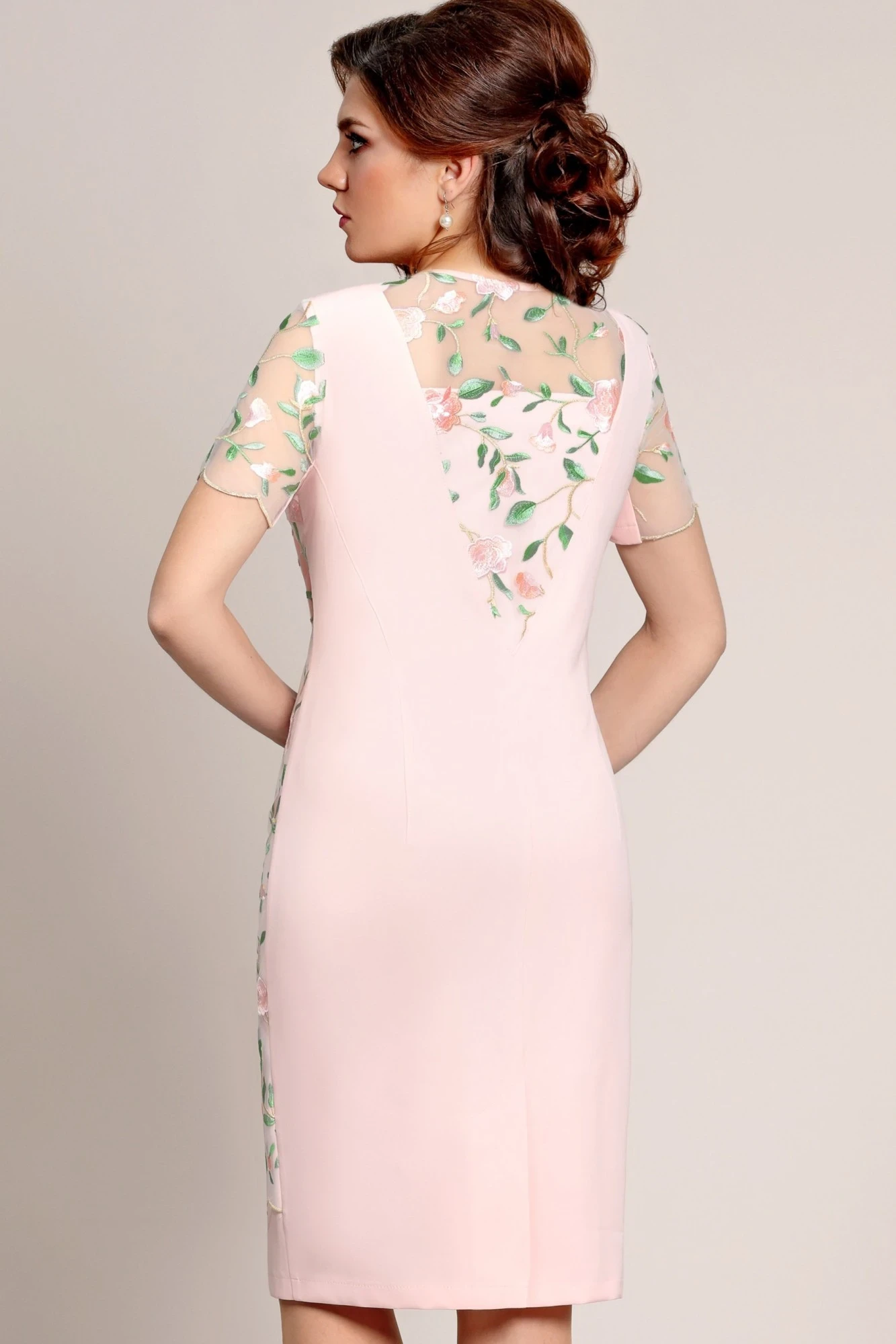 Платье женское полуприлегающего силуэта. По переду имеются талиевые и нагрудные вытачки. Горловина круглой формы. На полочку наложен гипюр, вставленный в боковые швы. По спинке имеются фигурные рельефы, переходящие в вытачки, вырез со вставкой из гипюра и средний шов со шлицей. Рукав втачной одношовный со вставкой из однотона в нижней его части. Верхняя часть рукава выполнена из гипюра.