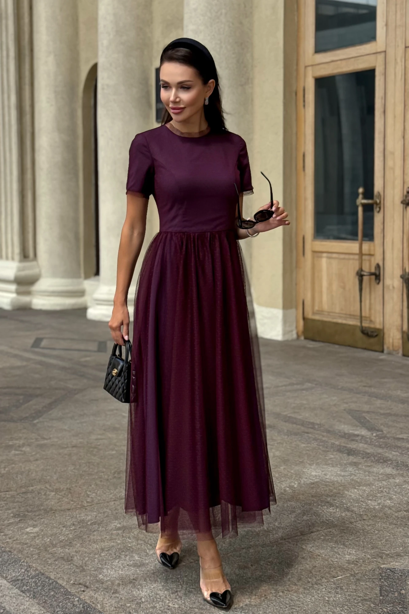 "Нарядное вечернее платье из фатина — это идеальный выбор для женщин, которые ищут элегантный образ для торжества, свадьбы, юбилея или праздничного мероприятия. Платье женское, полуприлегающего силуэта, отрезное по линии талии, двухслойное, выполнено из плательной ткани в сочетании с сеткой. Верхний слой из отделочной ткани - сетка, нижний слой из плательной ткани.