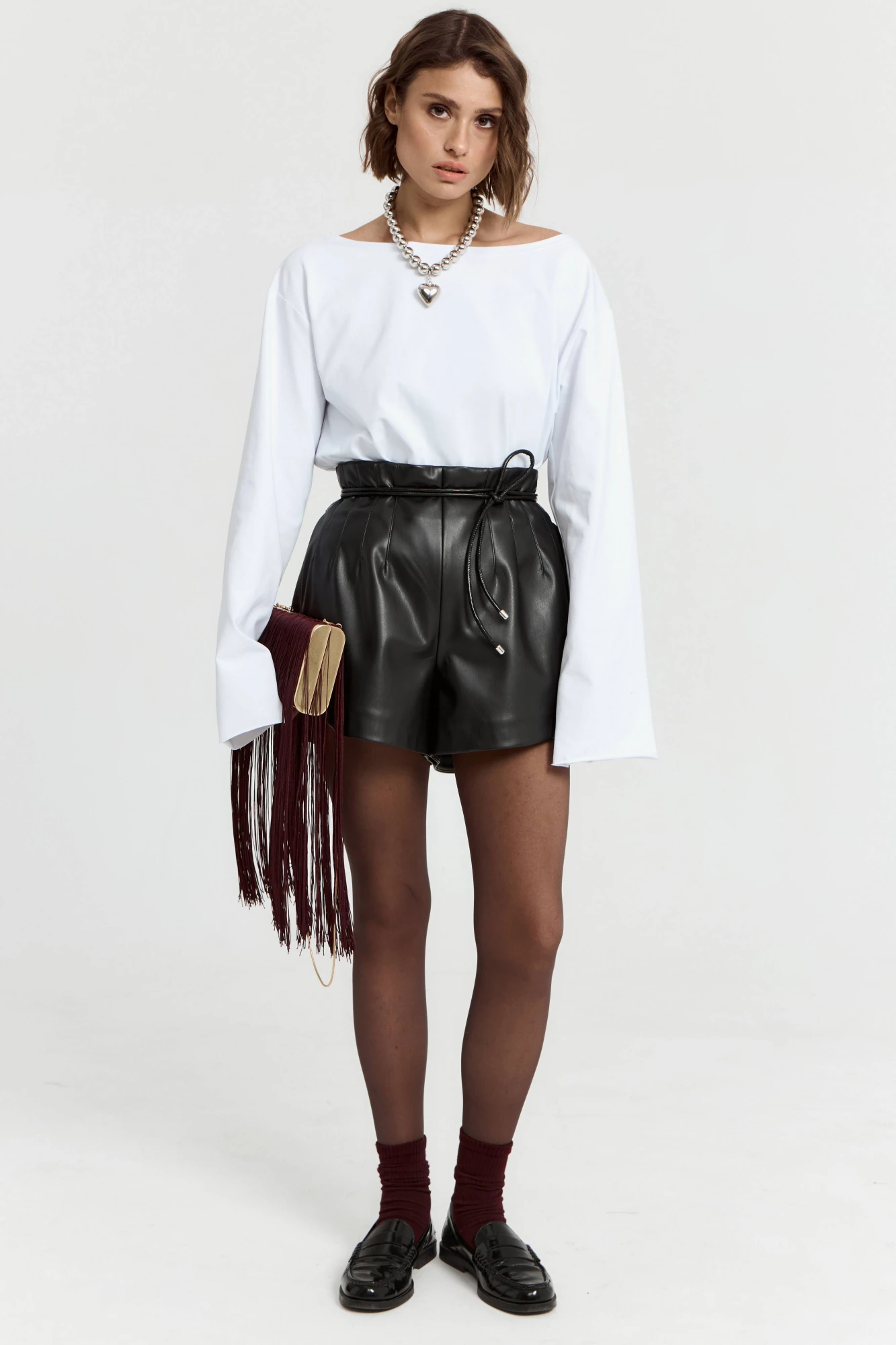 Шорты в длине мини из экокожи. Посадка высокая, по талии декоративные выточки, потайная молния по спинке изделия.