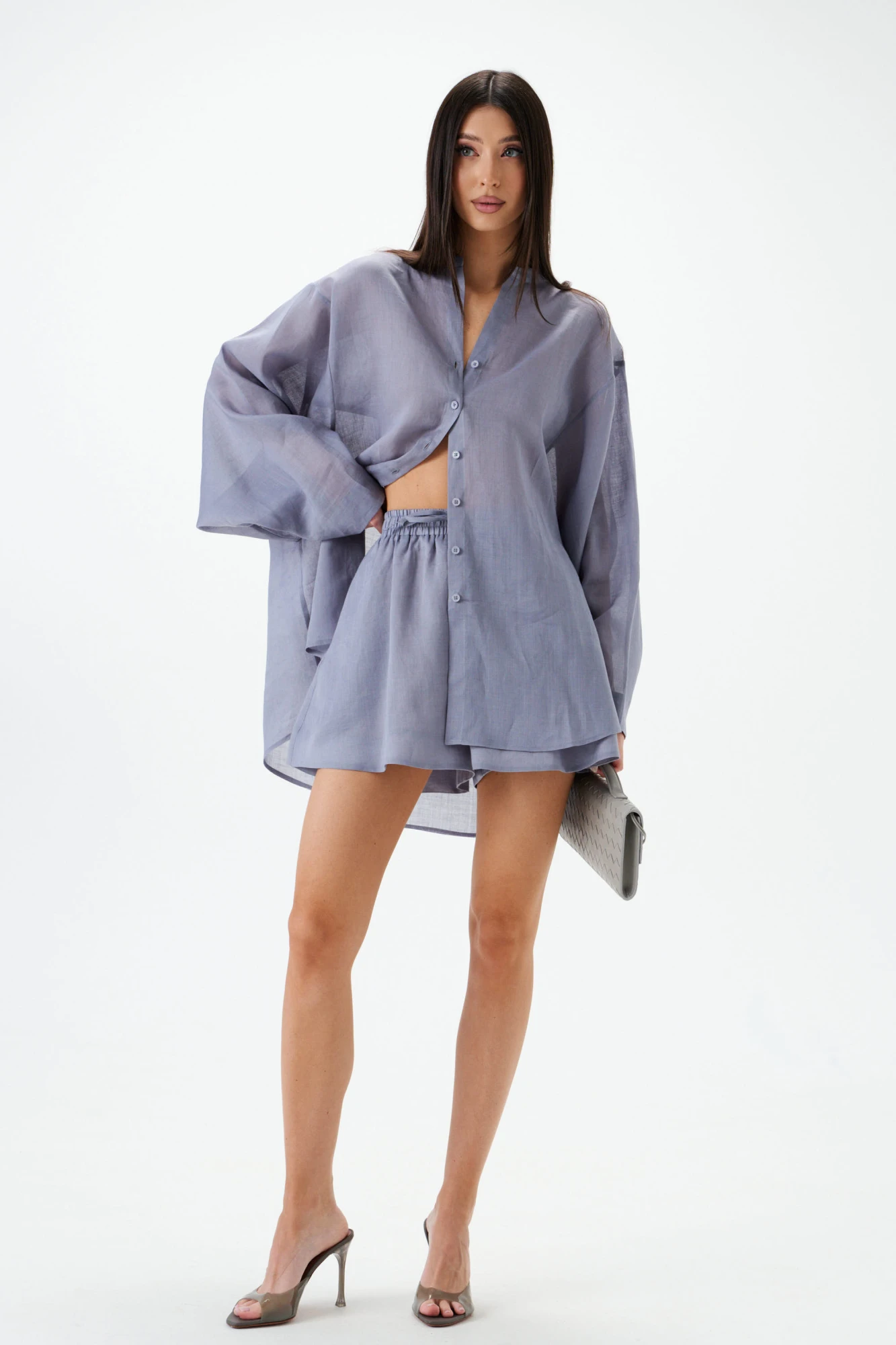 Шорты свободного кроя. Выполнены из лёгкого натурального полотна – рами. Пояс на резинке с завязками. В боковых швах карманы. Есть подкладка. Длина 40 см