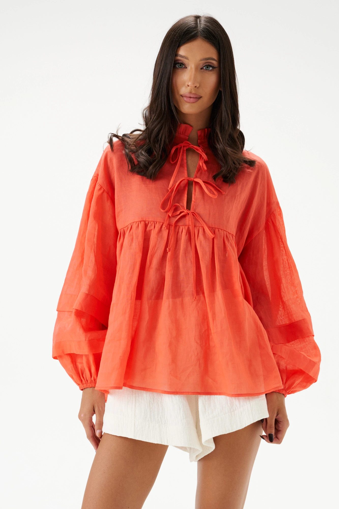Шорты свободного кроя. Выполнены из хлопкового полотна белого цвета – муслин. Без подкладки. Пояс на резинке. В боковых швах карманы с отрезным бочком. По передней и задней частям вертикальные швы. По переду имитация застёжки. В боковых швах по низу разрезы (3 см). Длина по боковому шву 30 см. Шорты дополнит кардиган А2208