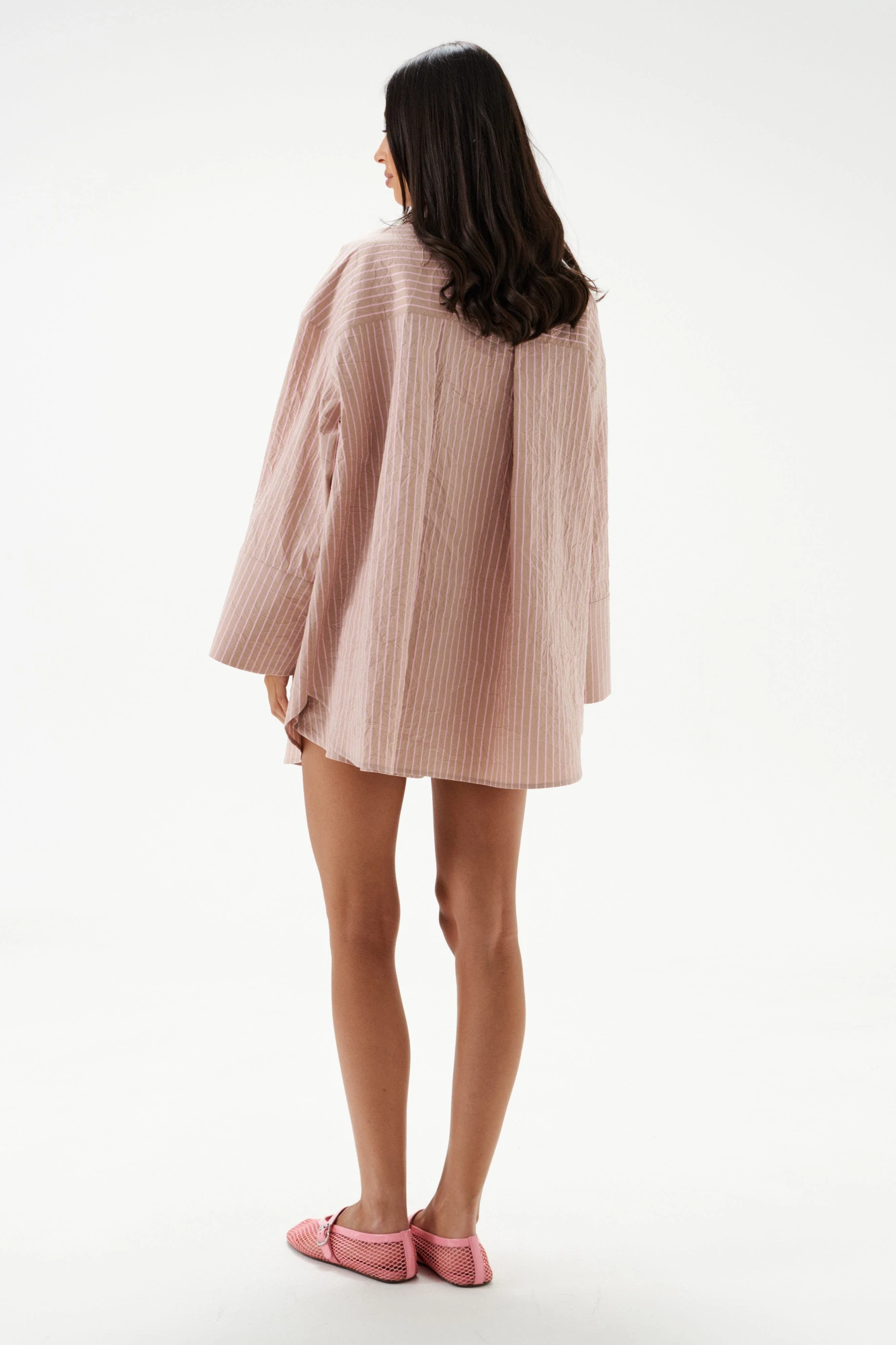 Шорты выполненные из текстильного жжатого полотна песочного цвета в розовую полоску. Характеристики: широкие, короткие, пояс притачной, присборен на резинку. Имеет две отделочные строчки по краям, образующие кулису, в которую продет шнур-завязка. В боковых швах карманы с отрезным бочком. Низ обработан в подгибку с закрытым срезом. длина 32 см