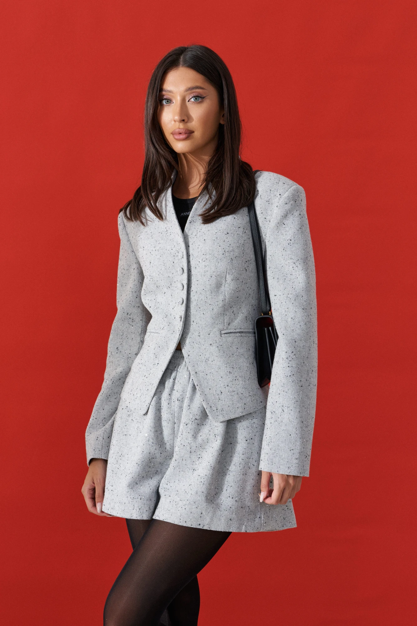 Шорты свободного кроя. Выполнены из фактурной ткани серого цвета со стразами и вкраплениями контрастной нити (чёрного цвета). С подкладкой. Пояс на резинке. В боковых швах карманы. Длина 38 смШорты дополнят жакеты А5498, А5499