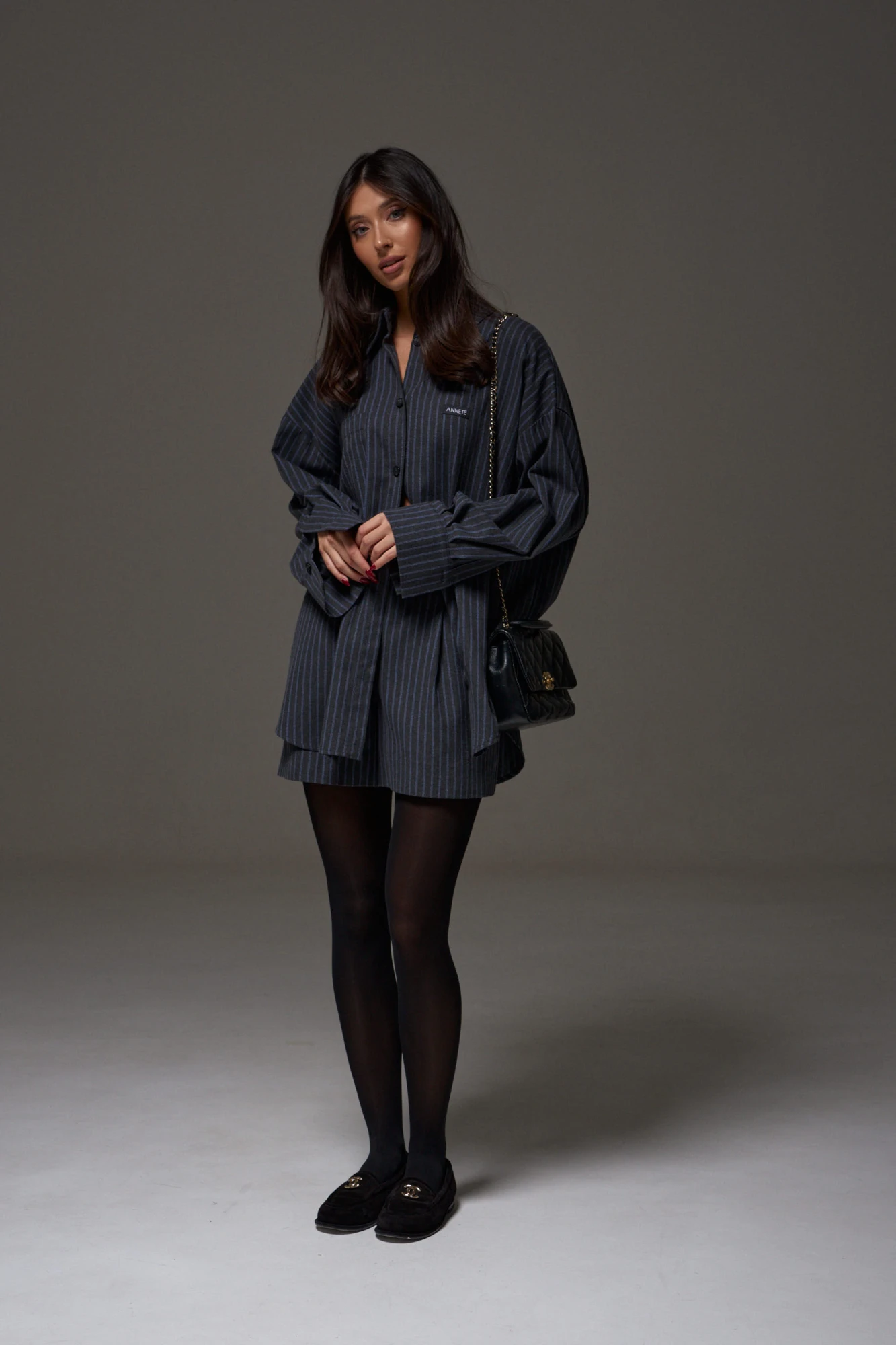 Шорты свободного кроя. Выполнены из костюмной ткани серого цвета в голубую полоску. С подкладкой. Пояс стабильный по переду, по спинке на резинке. По переду складки. Застёжка центральная - пуговица, молния. Карманы наклонные из боковых швов. Длина 42 см