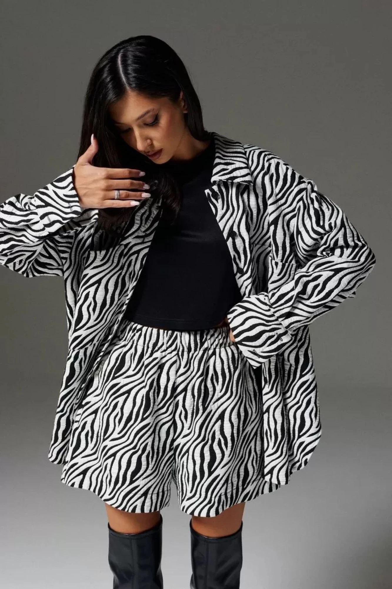 Шорты прямого кроя выполнены из полотна с анималистическим контрастным принтом . Характеристики: прямой крой, пояс стабильный, по поясу нашиты шлевки, застежка молния пуговичка, боковые карманы. Длина шорт 41 см.