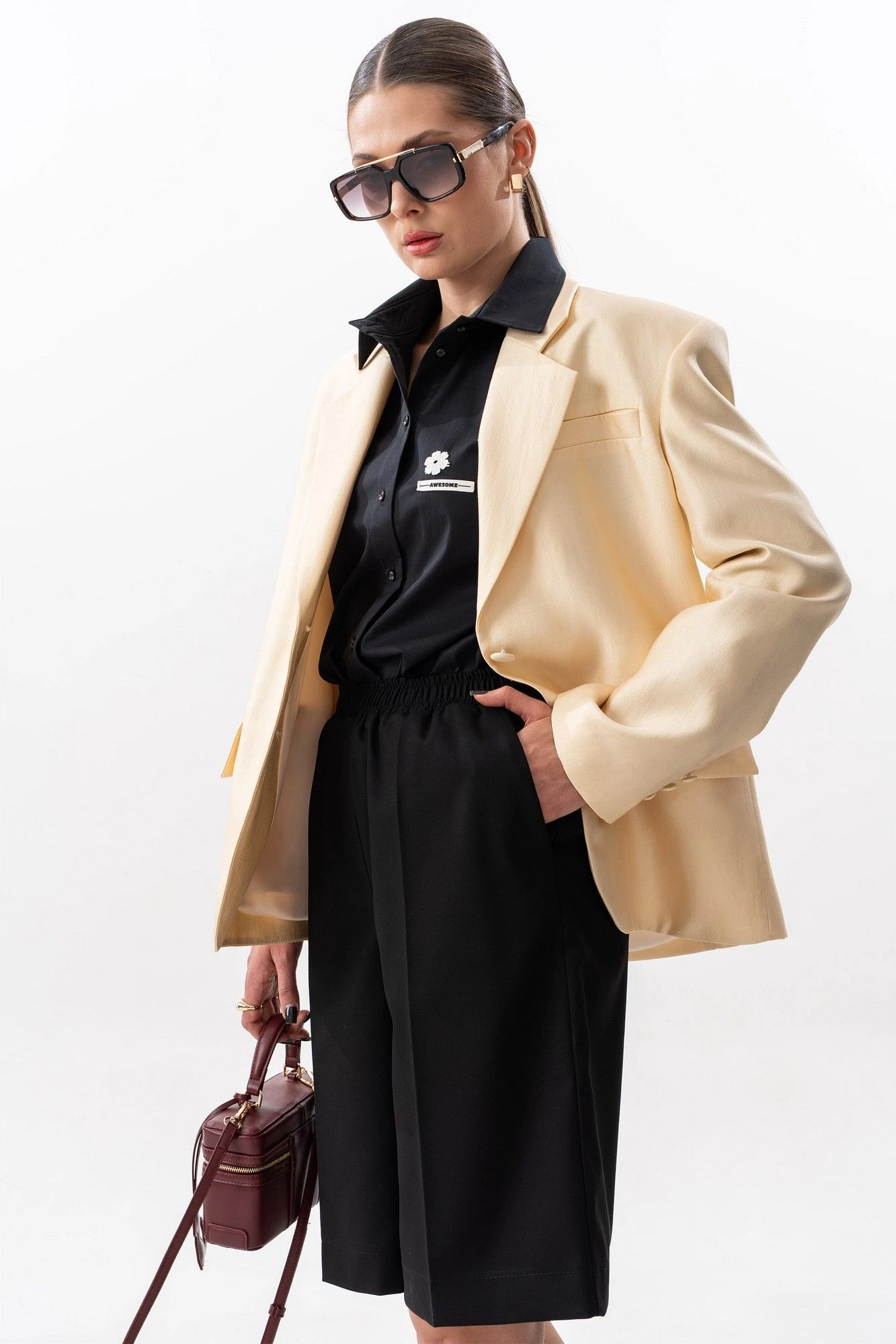 Шорты прямого свободного силуэта. Пояс на резинке, по переду боковые наклонные карманы. Задняя часть с внутренними карманами с листочкой. Длина шорт по боковому шву с поясом 59 см. Параметры брюк в готовом виде в 44 р.: обхват талии +-66 см (с резинкой ), обхват бедер 108 см. На фото: блузка S-7632, жакет S-2635