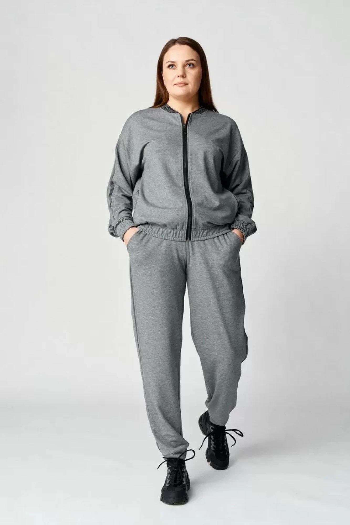 "Универсальный женский костюм, состоящий из джемпера и брюк, выполненный в спортивном стиле, станет незаменим для Вашего гардероба. Джемпер на молнии, со спущенной линией плеча. Имеются боковые карманы. Рукав втачной, длинный. По низу джемпера и рукава, пришивная манжета на резинке. Горловина округлая, в которую вставлен плосколежащий воротник-стойка из довяза. Брюки свободные на манжете с резинкой и отрезным поясом с эластичной резинкой внутри. В брюках имеются функциональные карманы. По боковым швам брюк и по рукаву джемпера пришиты лампасы.