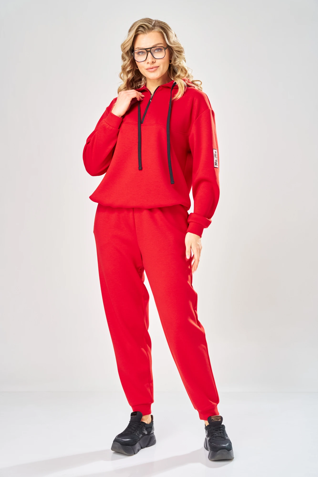 Комплект женский состоит из джемпера и брюк, выполнен из трикотажного полотна. Джемпер прямого силуэта, с притачным одношовным капюшоном. Капюшон с обработамыми люверсами и протянутым шнуром. Спинка без конструктивных элементов. Перед с кокеткой и застежкой на тесьму-молнию, доходящей до шва притачивания кокетки. По низу центра переда обработаны люверсы и протянут шнур. Рукава на спущенной пройме, одношовные, длинные, по низу притачная манжета. На левом рукаве по центру настрочена декоративная нашивка. Брюки прямого силуэта, зауженные к низу, с притачным поясом. Внутри пояса эластичная тесьма, и проложены две строчки. Брюки по низу с притачными манжетами. На передних половинках брюк обработаны боковые карманы со скосом. Длина джемпера 65 см, длина рукава 58 см, длина брюк с манжетом и поясом 105 см.