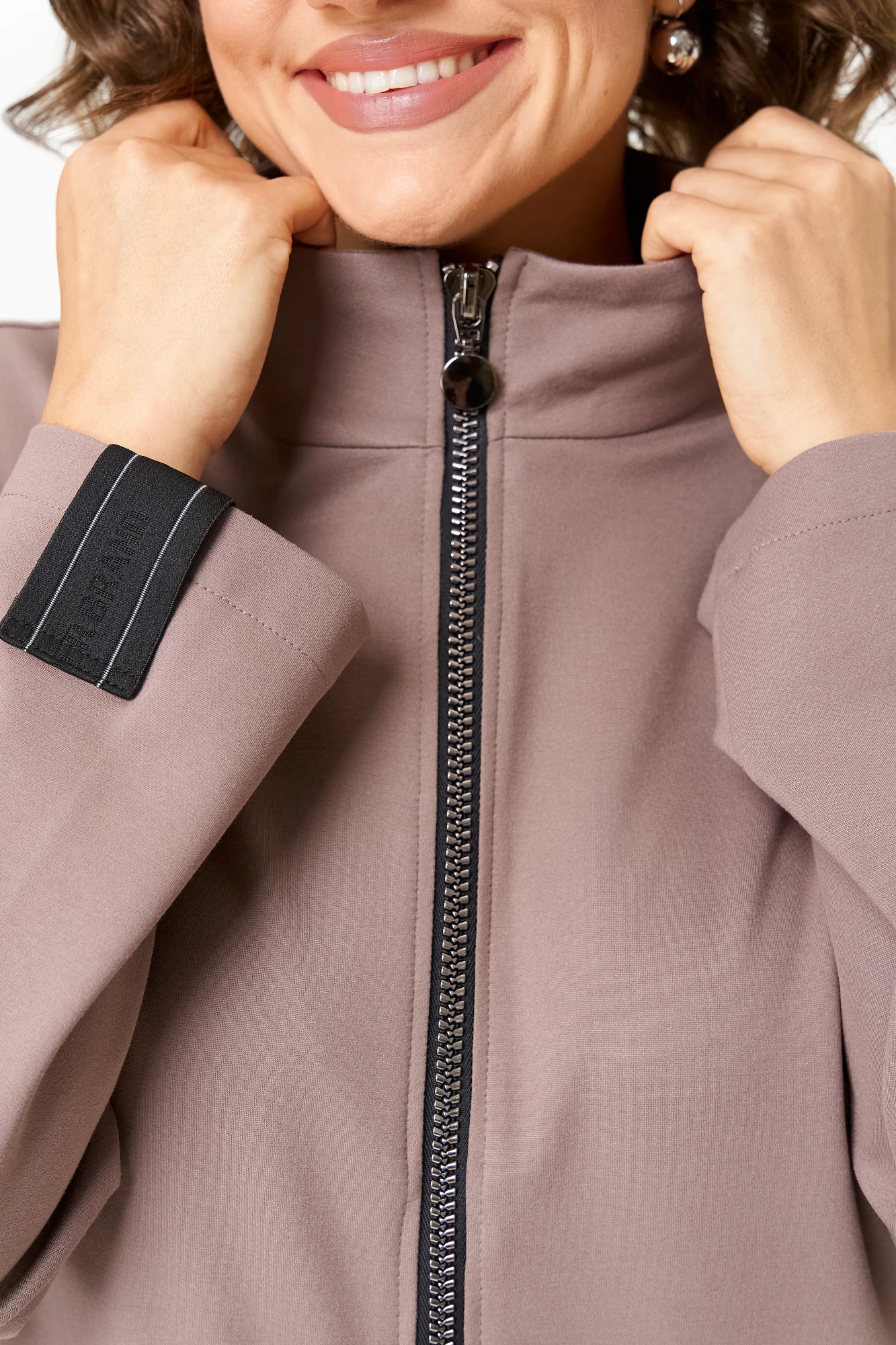 Бомбер свободного силуэта с центральной застежкой на декоративную молнию, горловина со стойкой. На уровне бедер накладные карманы с клапаном. Нижняя планка бомбера с декоративной тесьмой. Рукава втачные, по низу отделочная деталь из тесьмы.