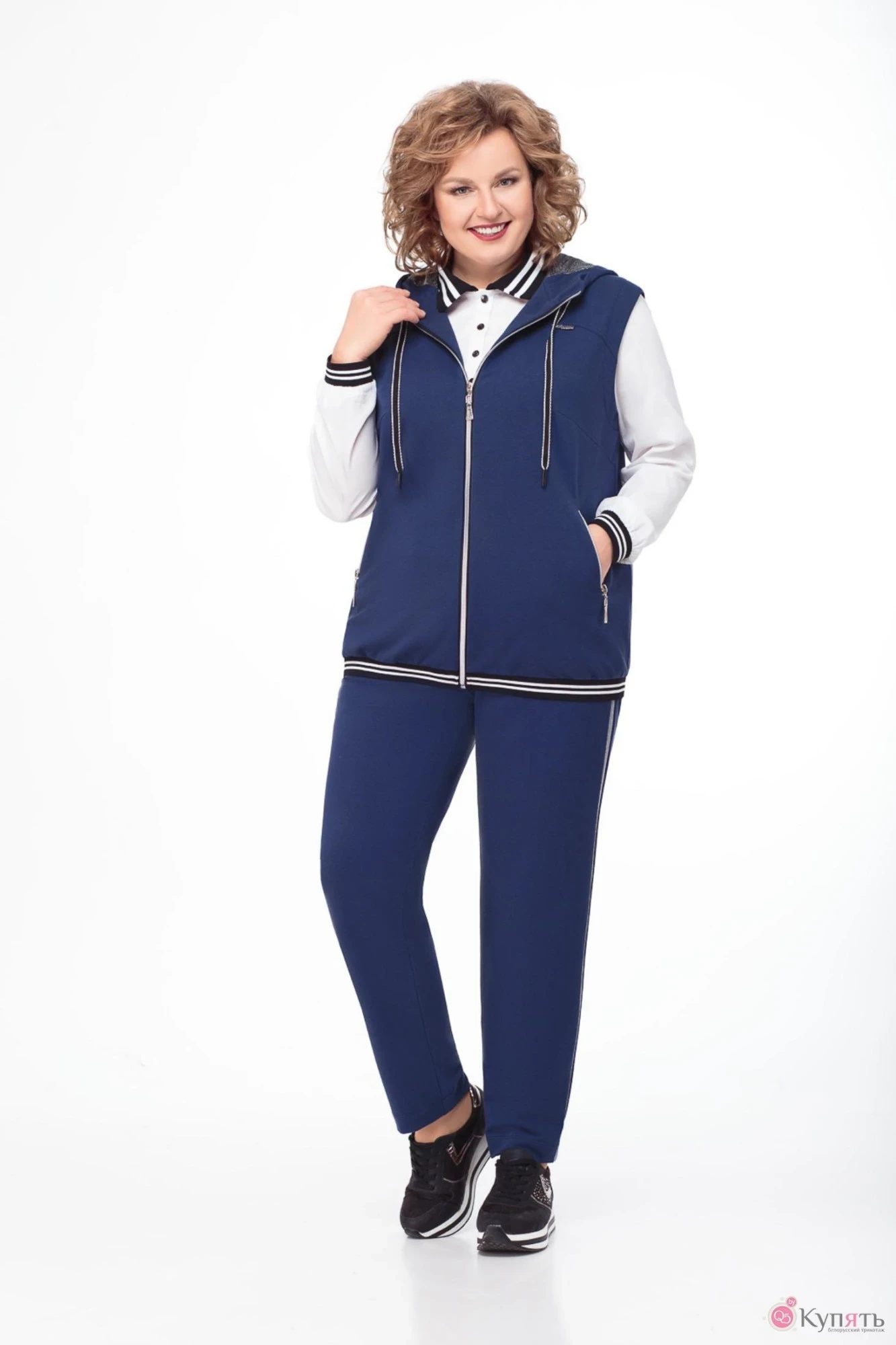 Элегантный женский комплект выполнен в спортивном стиле, из трикотажного полотна. Комплект состоит из жилета, брюк и блузы. Жилет полуприлегающего силуэта с центральной застежкой на тесьму «молния», горловина оформлена капюшоном, с подкладкой из отделочной ткани. По переду обработаны прорезные карманы с молниями, низ жилета оформлен довязом. Брюки ,зауженные к низу, по боковым швам лампасы из отделочной ткани, по переду на уровне бедер прорезные карманы с листочкой. Пояс на резинке. Блуза выполнена из хлопчатобумажной ткани, по переду и спинке рельефные швы. Горловина с воротником из трикотажного довяза, по центру переда планка с застежкой на петли- пуговицы. По спинке в рельефных швах разрезы. Рукава втачные одношовные, по низу рукава довяз.
