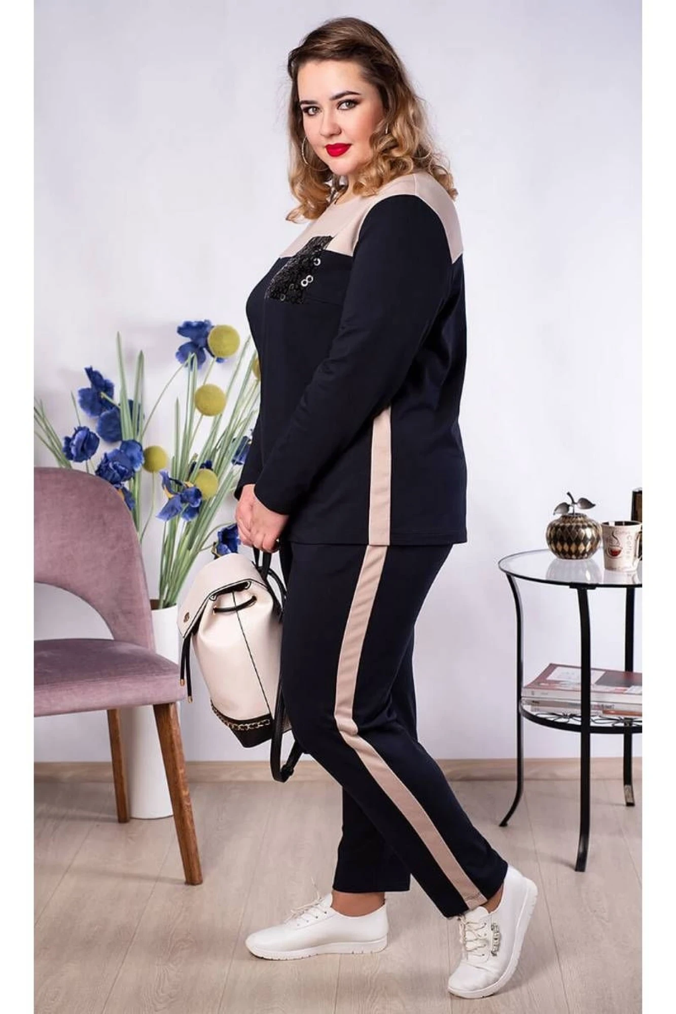 Классный костюм в стиле спорт-шик от Cameliа из качественного трикотажа с содержанием хлопка. Данная модель состоит из спортивных брюк с лампасами и блузки с кокеткой из контрастной ткани. Для удобства предусмотрены карманы в боковых швах брюк и широкая мягкая резинка, не сдавливающая талию. Изюминка модели - накладная деталь с пайетками в виде декоративного кармашка. Обратите внимание, что костюм хорошо сядет на фигуре, разница у которой между объемом груди и объемом бедер примерно 8 см.