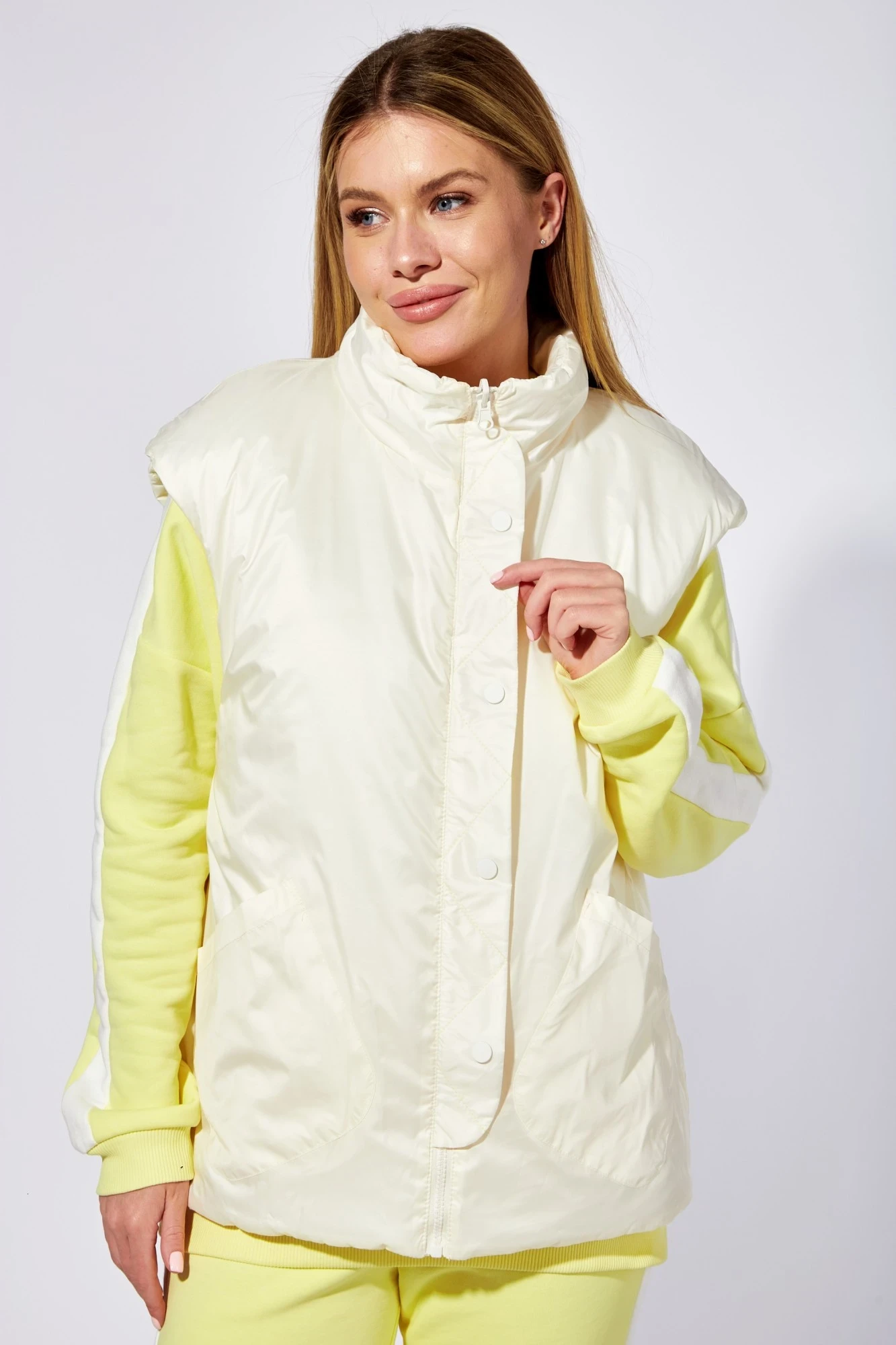 Комплект брючный(кофта +брюки+жилетка).Кофта прямого силуэта со спущенным плечом , рукав втачной одношовный с притачным манжетом, по низу изделия притачной пояс. Горловина обработана бейкой. По плечевому шву и рукаву лампас из отделочной ткани. Брюки прямые,верхний срез обработан поясом с резинкой и шнуром. По боковым швам лампас из отделочной ткани. Жилетка полуприлегающего силуэта с центральной застёжкой на тесьму-молнию,двусторонняя обработаны прорезные карманы с листочкой и накладные карманы с другой стороны. Используется две ткани. В качестве отделки используется отделочная строчка ,фурнитура,вышивка.