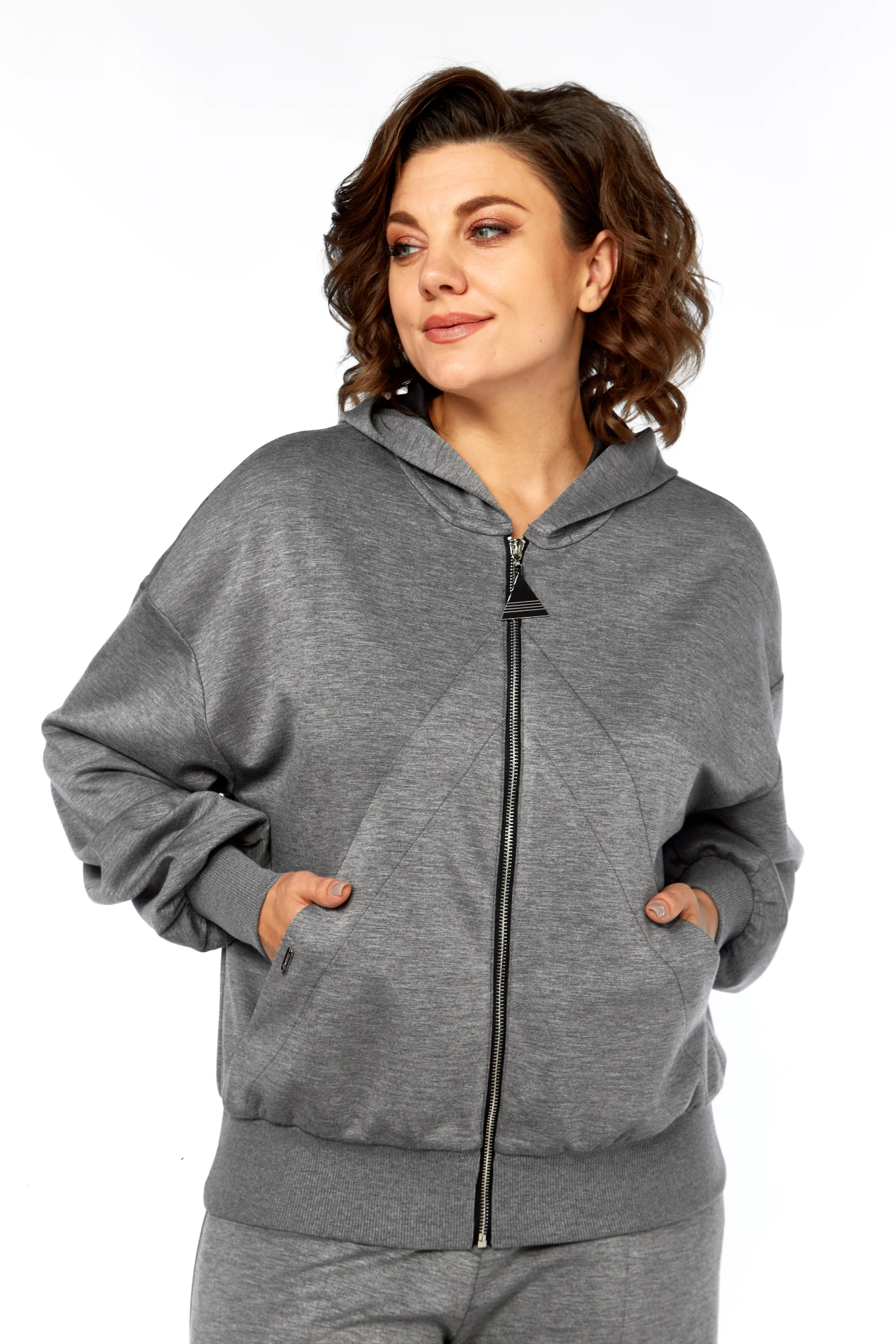 Комплект брючный кофта+брюки. Кофта свободного кроя с центральной застежкой на тесьму-молнию. Спущенная линия плеча, рукав втачной, 2-шовный с пританчым манжетом по низу (довяз). На локтевой части складки. По спинке средний шов. По переду рельефные швы-в швах обработаны карманы. По низу отделочный манжет (довяз). Капюшон со средней частью. Брюки широкие. Верхний срез обработан поясом с резинкой по спинке.В боковых швах обработаны карманы. В качестве отделки используется отделочная строчка и фурнитура.