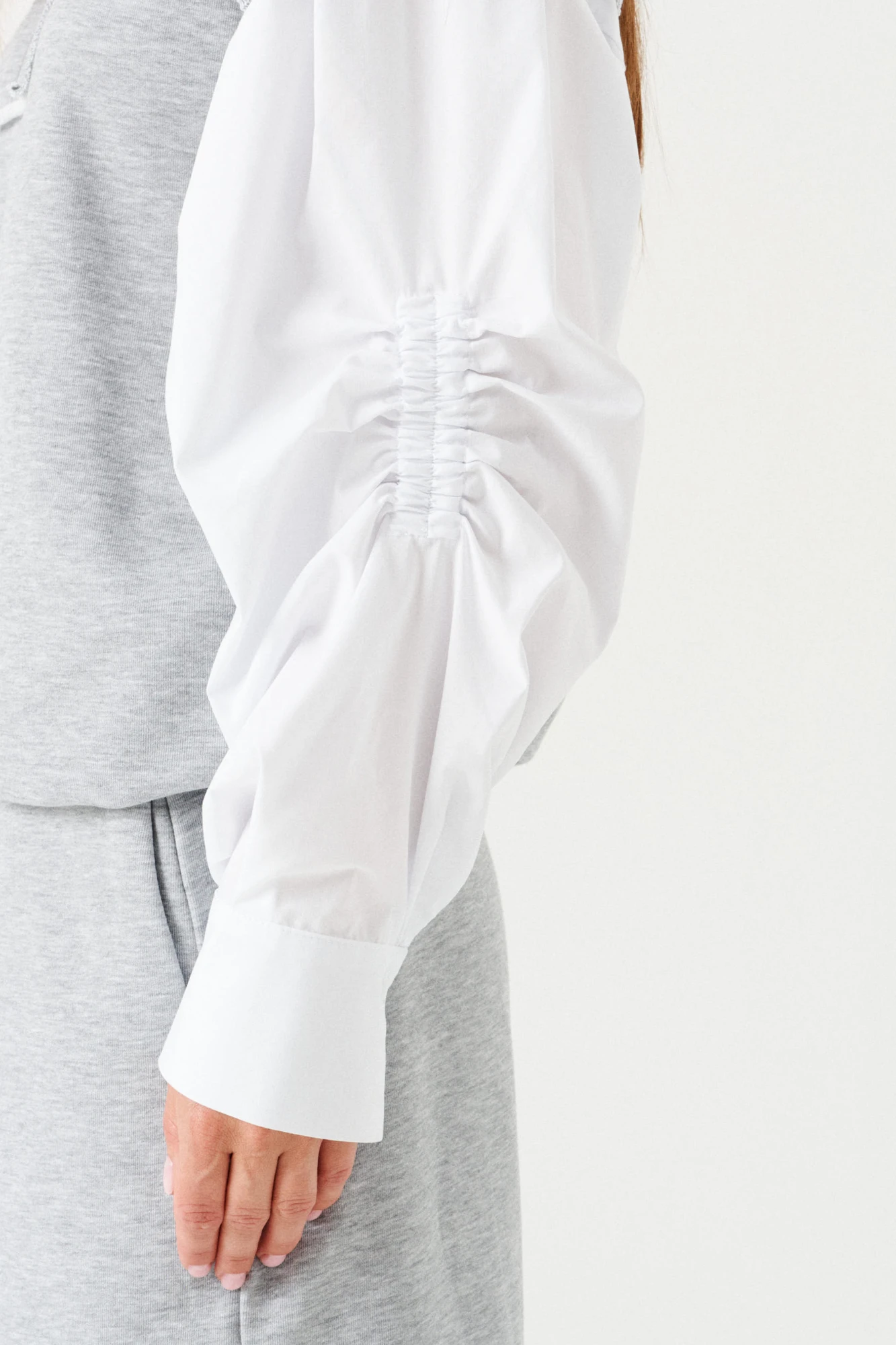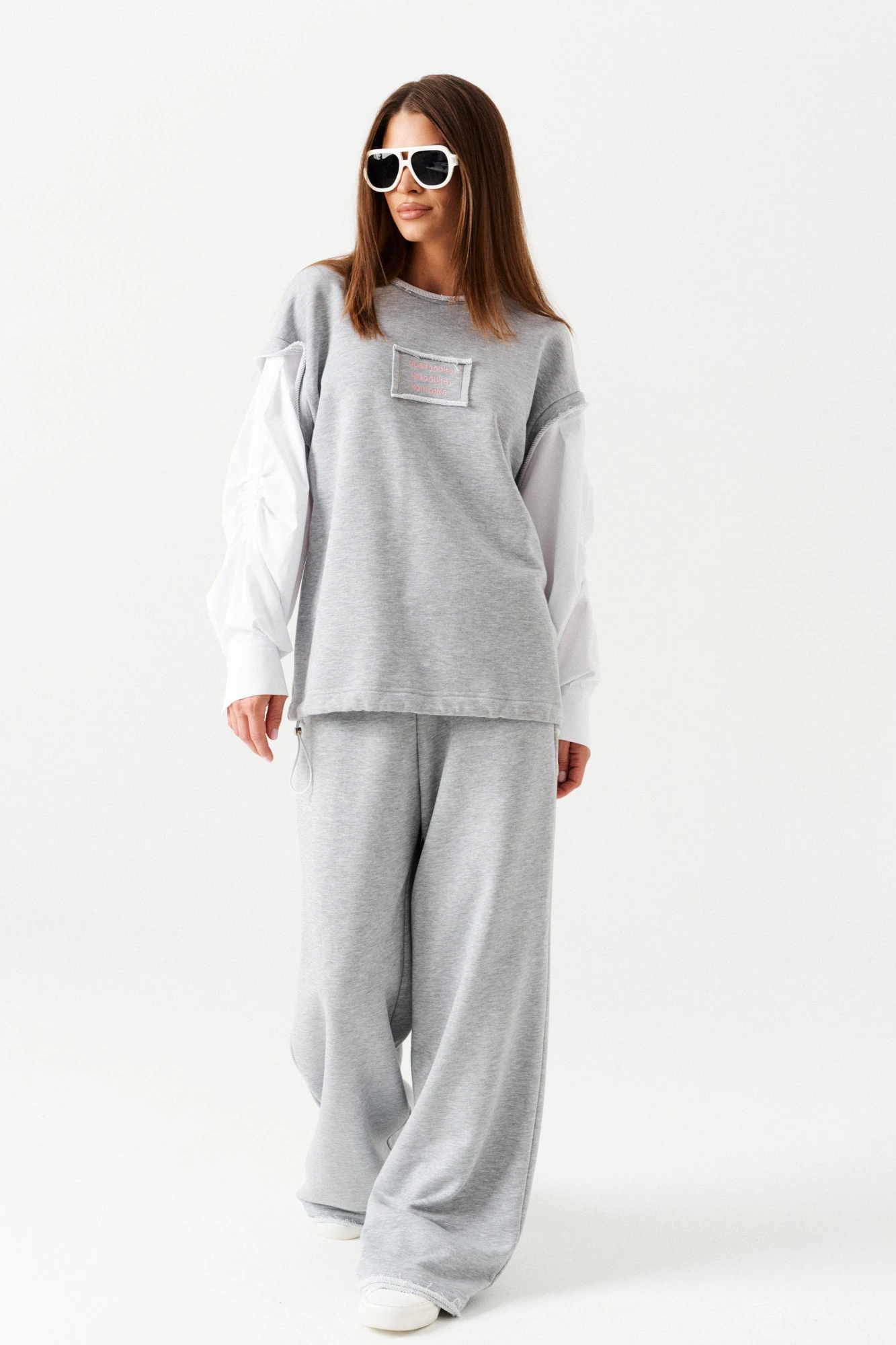 Комплект женский 2-х предметный из трикотажного полотна, состоящий из джемпера и брюк. Джемпер прямой, свободный, с двойным рукавом. Вырез горловины округлой формы с необработанным срезом, обработан обтачкой из полотна «рибана». По переду настрочная деталь с вышивкой "dushechka lapochka konfetka". Спинка цельная. Нижний рукав из хлопковой ткани, со сборкой на резинку на уровне локтя, отрезной манжетой, застежкой на 1 петлю и 1 пуговицу. По низу изделия кулиса с эластичным шнуром, регулируемым по боковым швам фиксатором. Брюки большого объема, прямого силуэта. В боковых швах расположены карманы. Пояс притачной, на резинке. По поясу проложены отделочные строчки, образующие кулиску, в которую вставлен шнур-завязка. На правой задней половинке брюк накладной карман. Нижний срез пояса, задний карман, низ изделия имеют необработанный край.