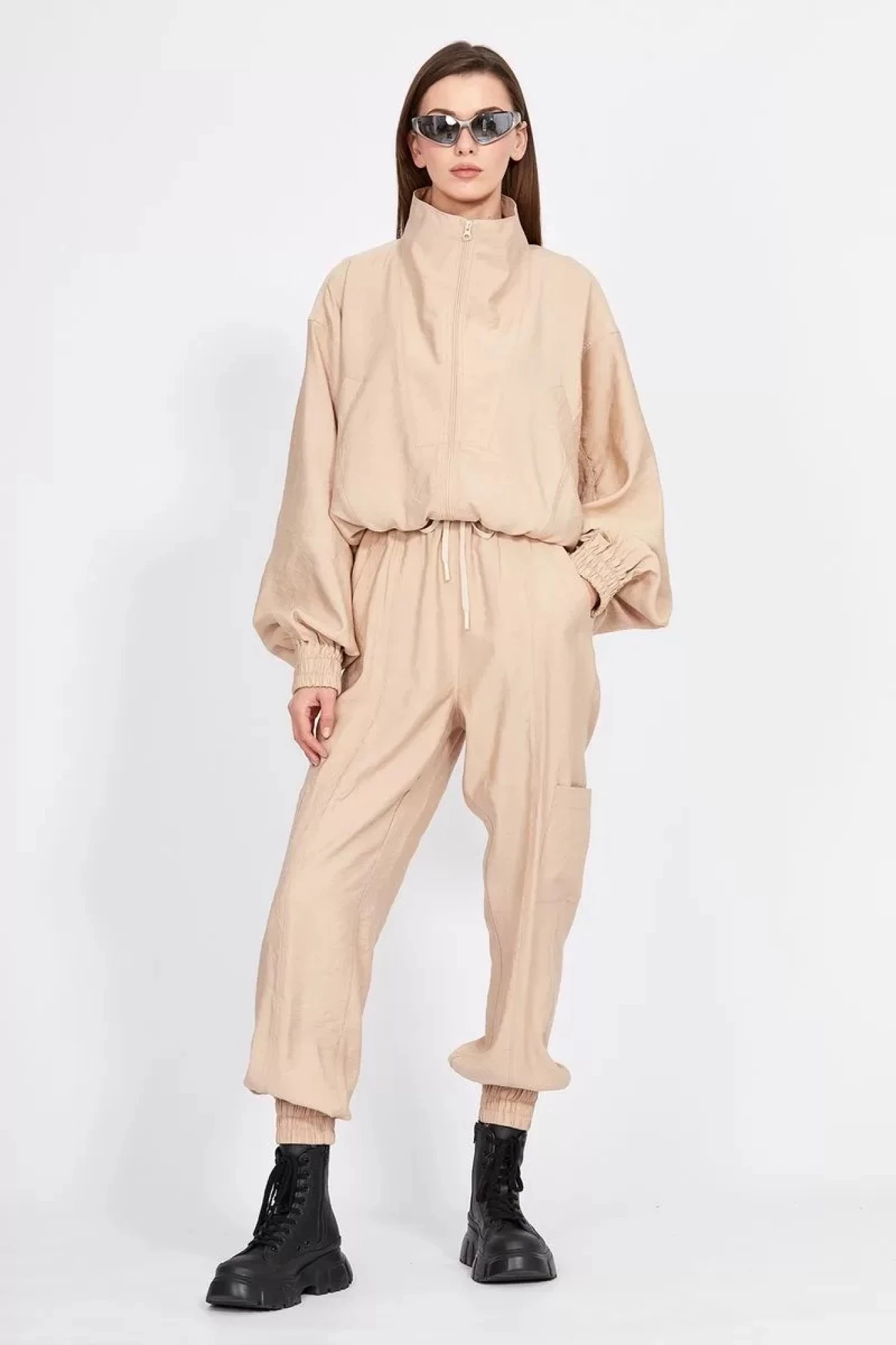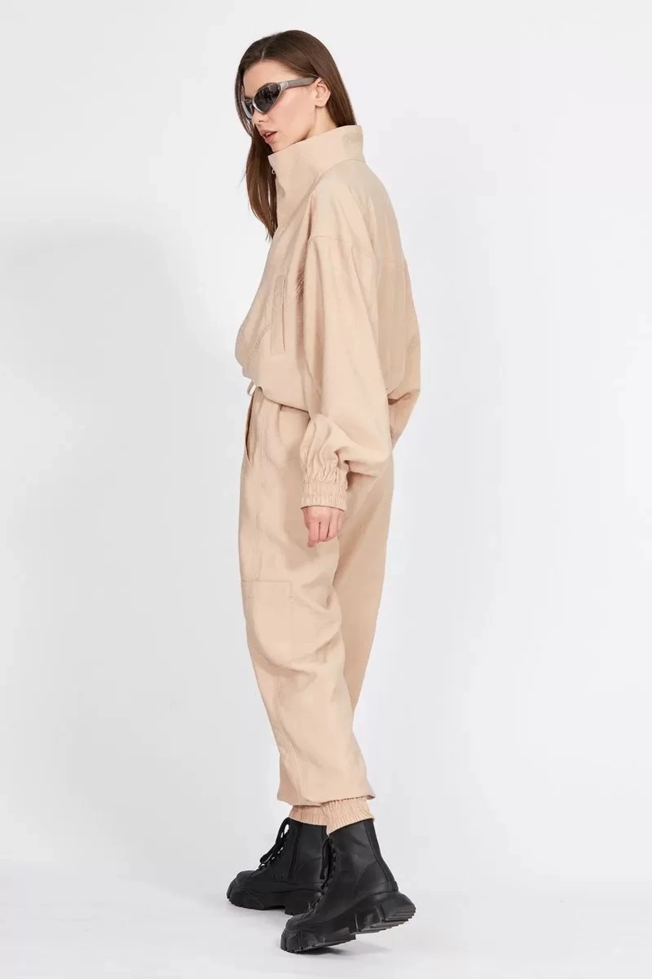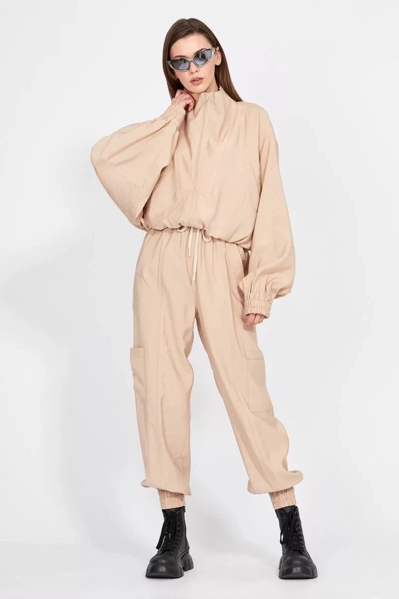 Комплект: куртка + брюки. Комплект выполнен из однотонного гладкокрашенного полотна с крэш-эффектом. Куртка покроя кимоно, на притачном поясе с эластичной тесьмой. Застежка спереди на молнию. Спереди прорезные карманы с листочкой и кокетка, переходящая в воротник-стойку. Рукав цельнокроенный, с горизонтальными и вертикальными подрезами, на притачной манжете с эластичной тесьмой. Брюки свободного покроя, на цельнокроенном поясе с эластичной тесьмой, заужены к низу. В пояс вставлен шнур. Спереди вертикальные рельефы и прорезные карманы с листочкой. Низ брюк на манжете с эластичной тесьмой. По боковому шву накладные карманы.